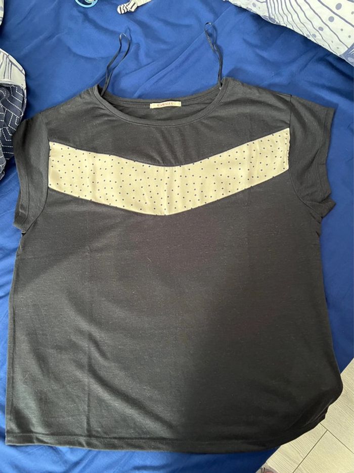 Tee shirt Camaieu bleu avec bande beige à motifs à l’avant. Taille L.