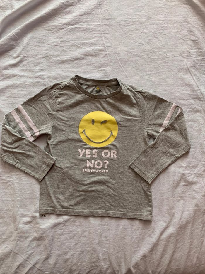 T shirt manches longues gris, smiley world, taille 6 ans (116cm), smiley jaune sur l’avant et bandes blanches sur les manches (un peu écaillées). En très bon état. #manoncrichard_enfant_6ans