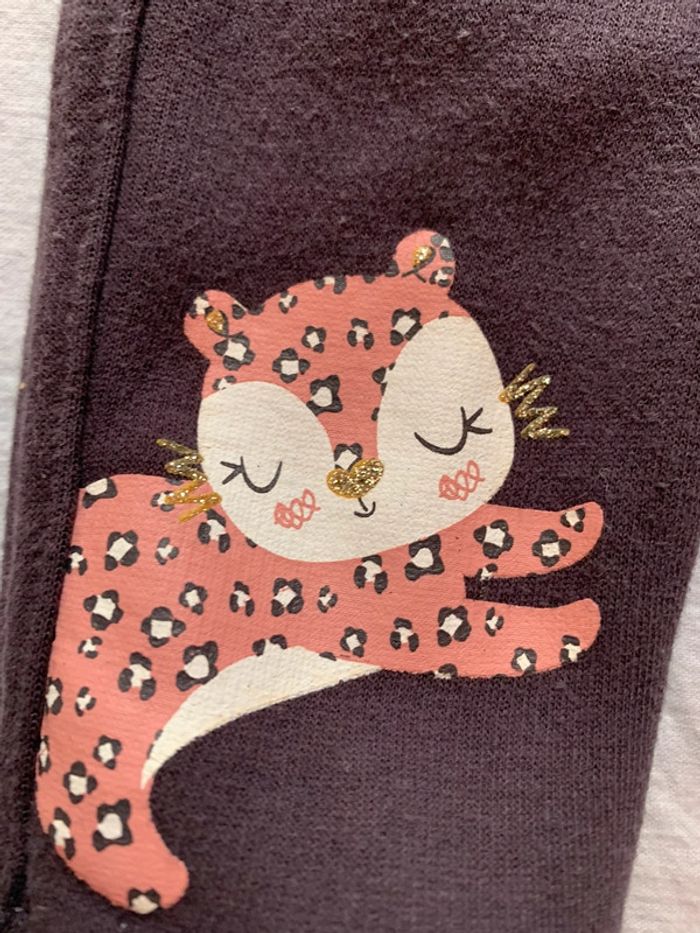 Pantalon doublé avec matière bien chaude et douce pour bébé. Couleur prune avec motifs petits léopards roses. En parfait état de la marque In Extenso. Taille 3 mois soit 62 cm. #manoncrichard_fille_3mois