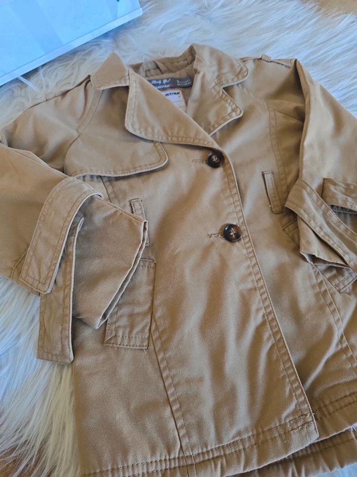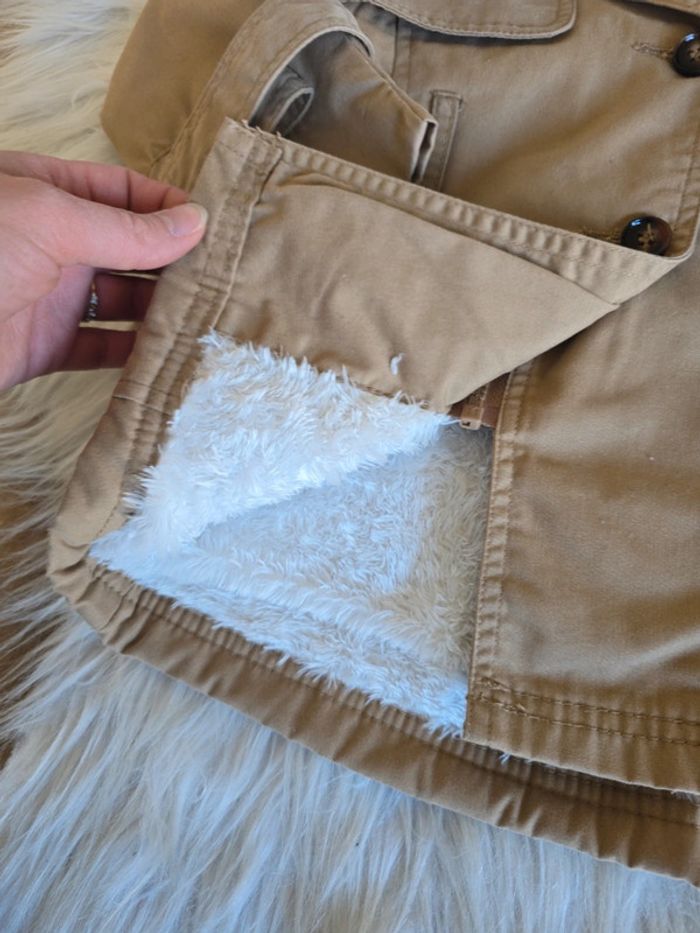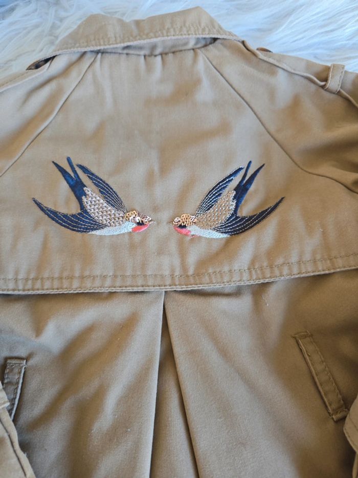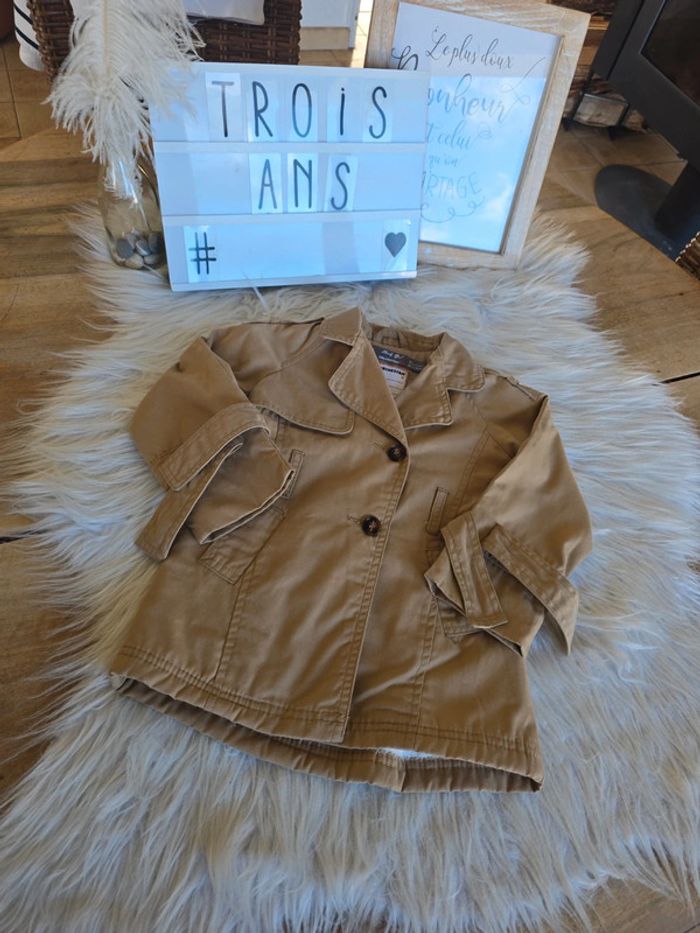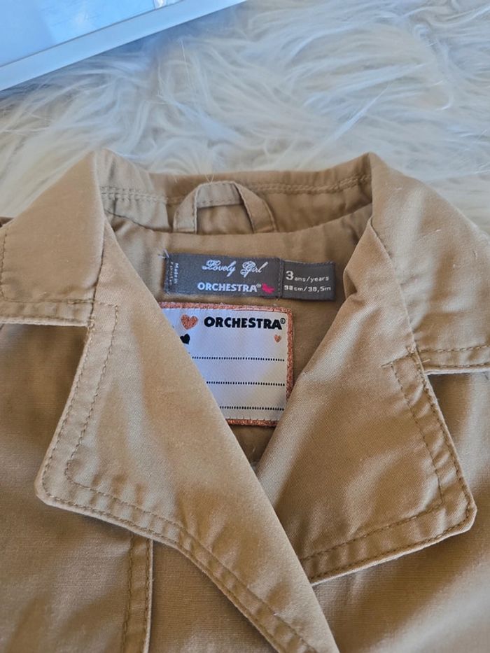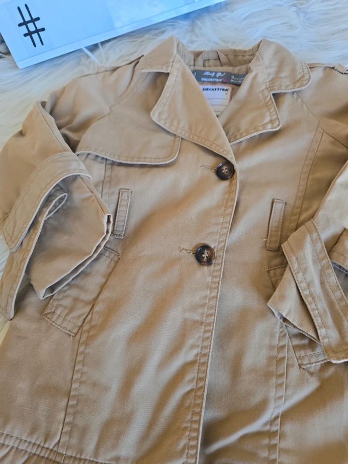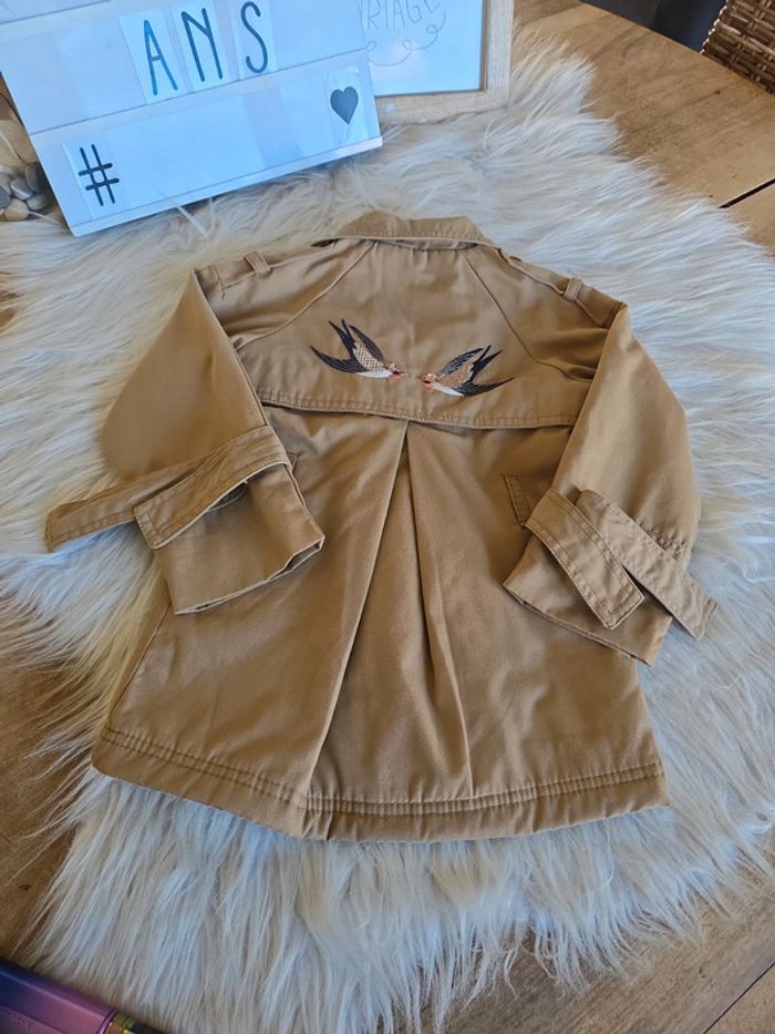 Trench marron intérieur chaud beige Dessin oiseaux dans le dos Fermeture éclair + boutons Manque la ceinture mais acheté comme ça. Taille 3 ans Marque orchestra Tres bon état