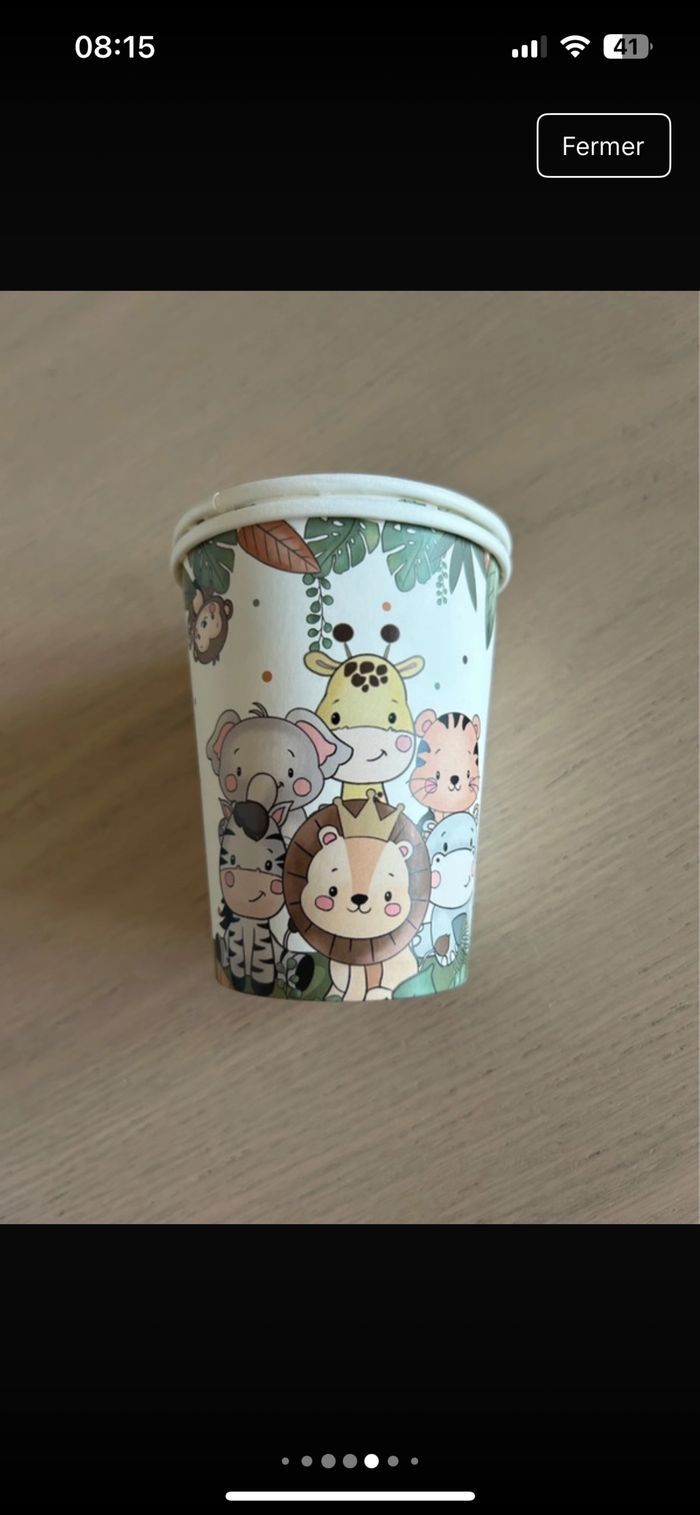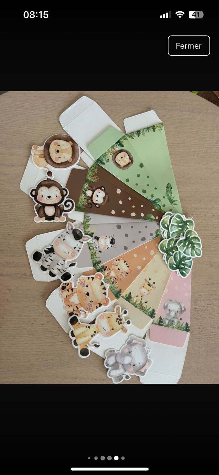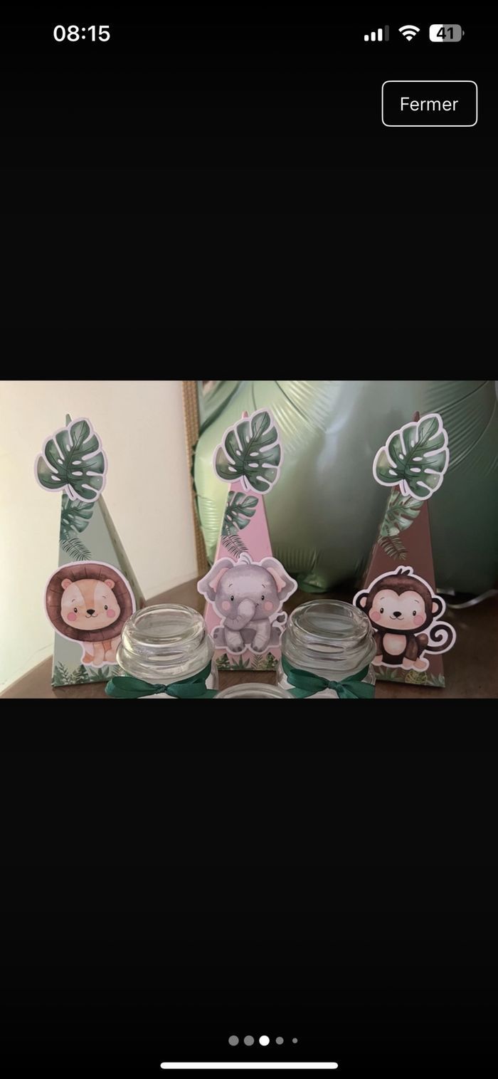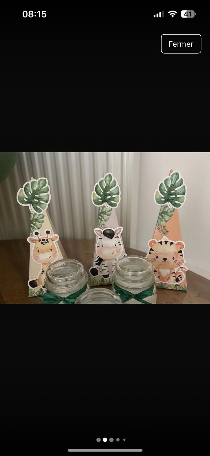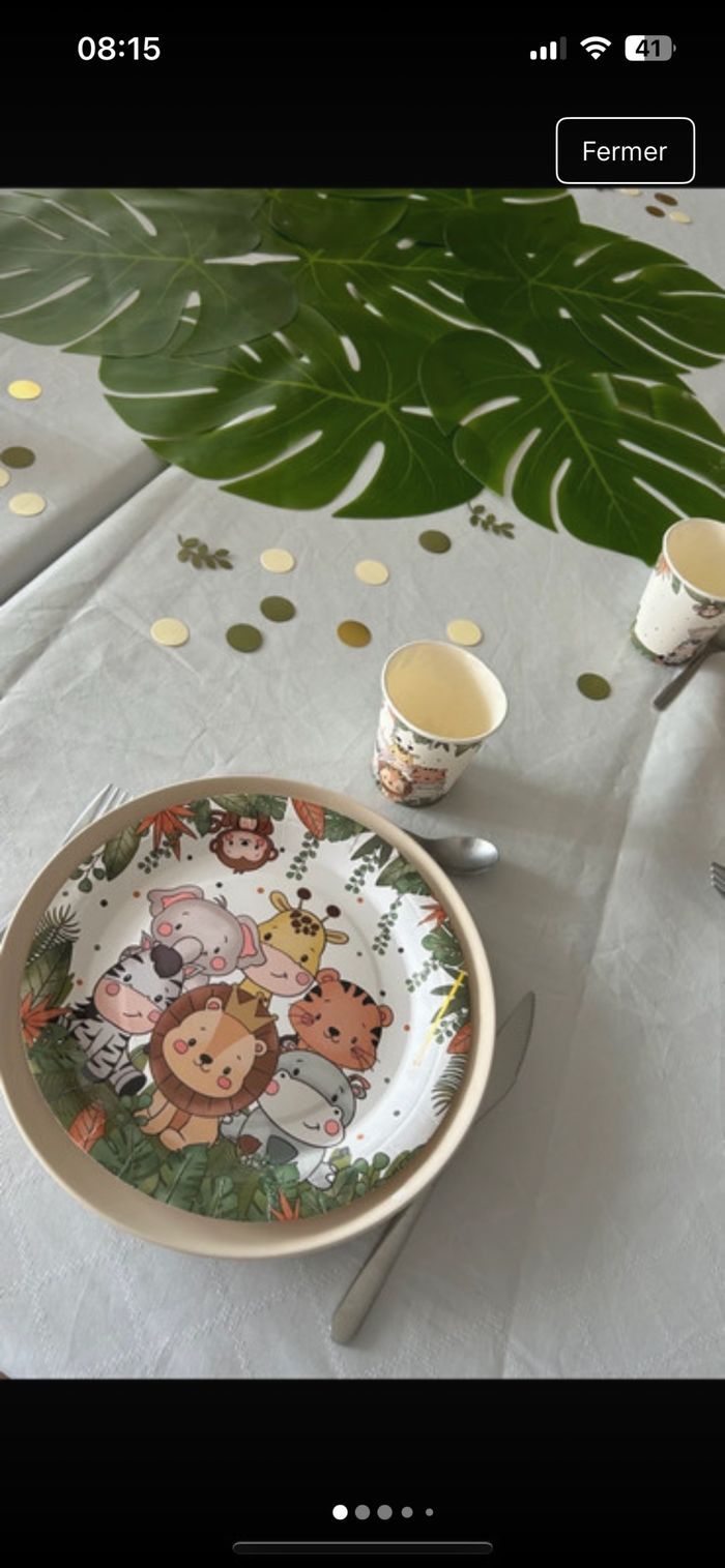Vends lot décoration fête bébé jungle comprenant : 12 assiettes 12 verres 2 paquet de 6 boites à dragées (12) 1 paquet de décoration pour la table