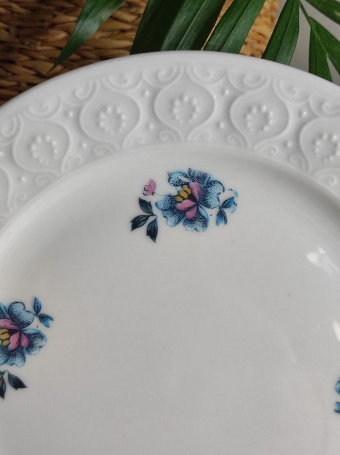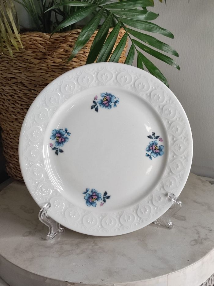 Superbe assiette à dessert en porcelaine de france. Petits motifs a fleurs bleu / rose sur le fond. Bordures en reliefs. Diamètre 17,5 cm