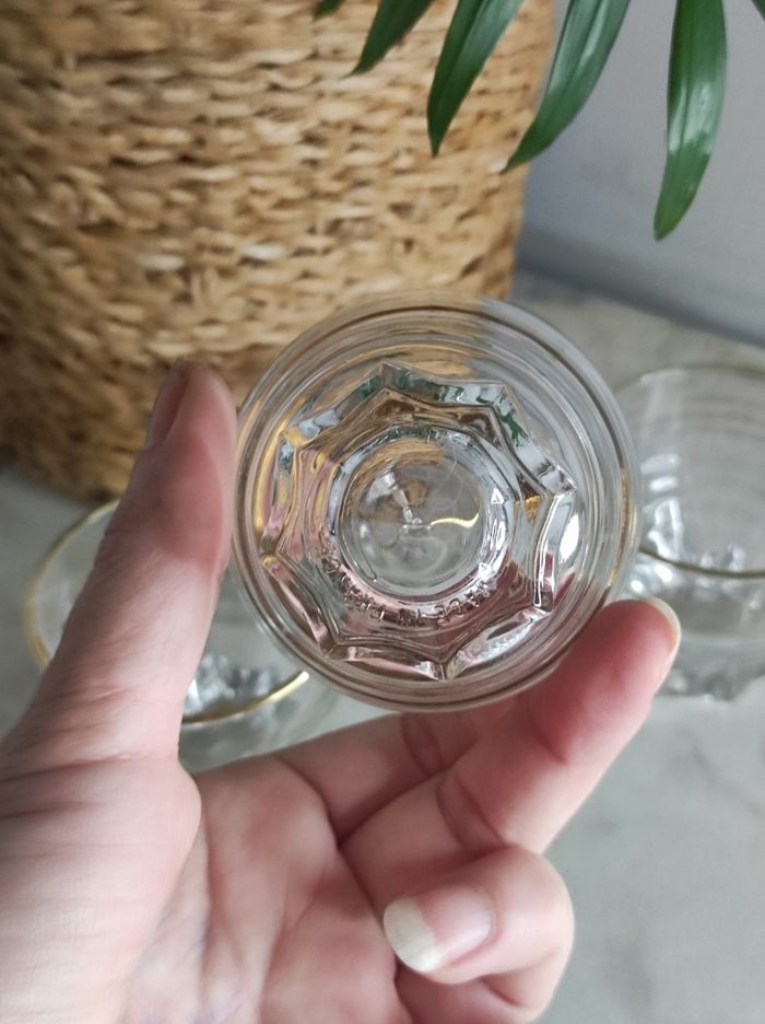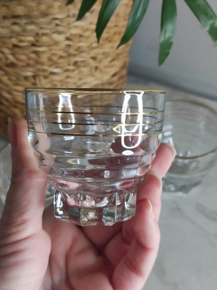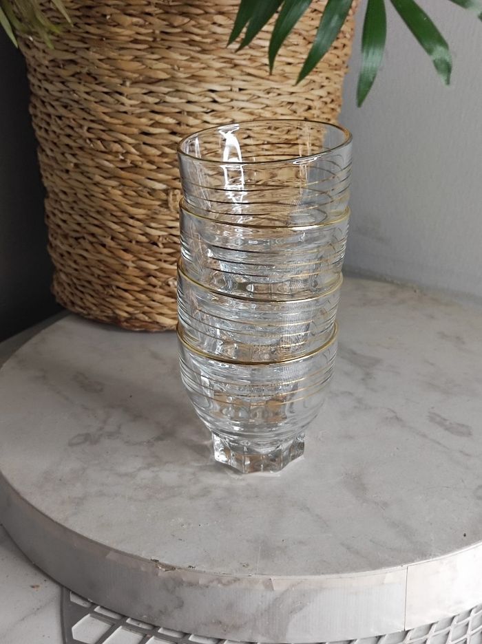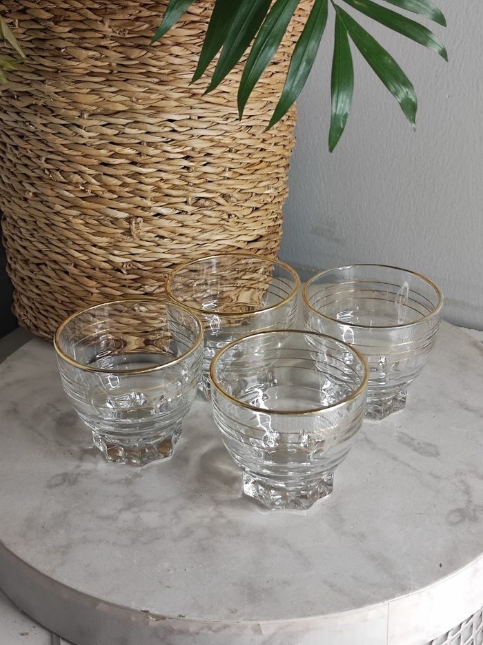 Joli lot de 4 petits verres au look rétro pour apéritif ou digestif Verre bordé d un liseret doré. Et pied en firme d'étoile. Dimensions H 6 x D 6,3 État impeccable