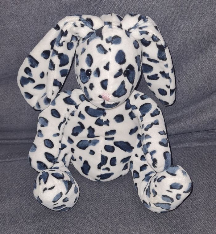 Doudou peluche Lapin en position assise et en velours de couleur blanc , tacheté noir Yeux billes . Nez en fil de couleur rose. Lapin qui mesure 22 cm env
