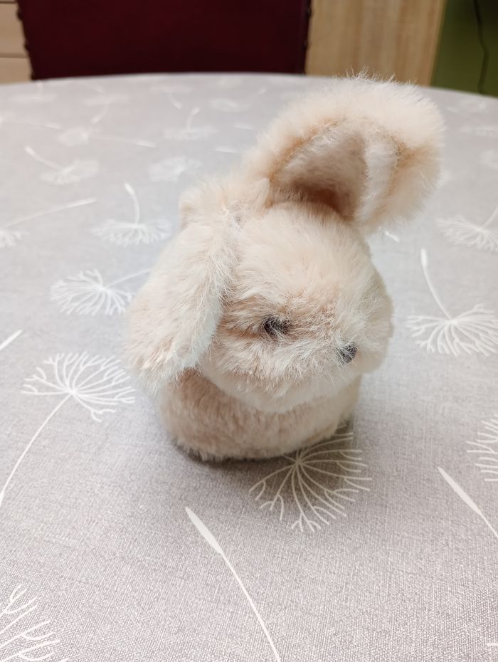 Lapin tout doux pour décoration de Pâques. Hauteur : 11 cm. Longueur : 12 cm. Très bon état.