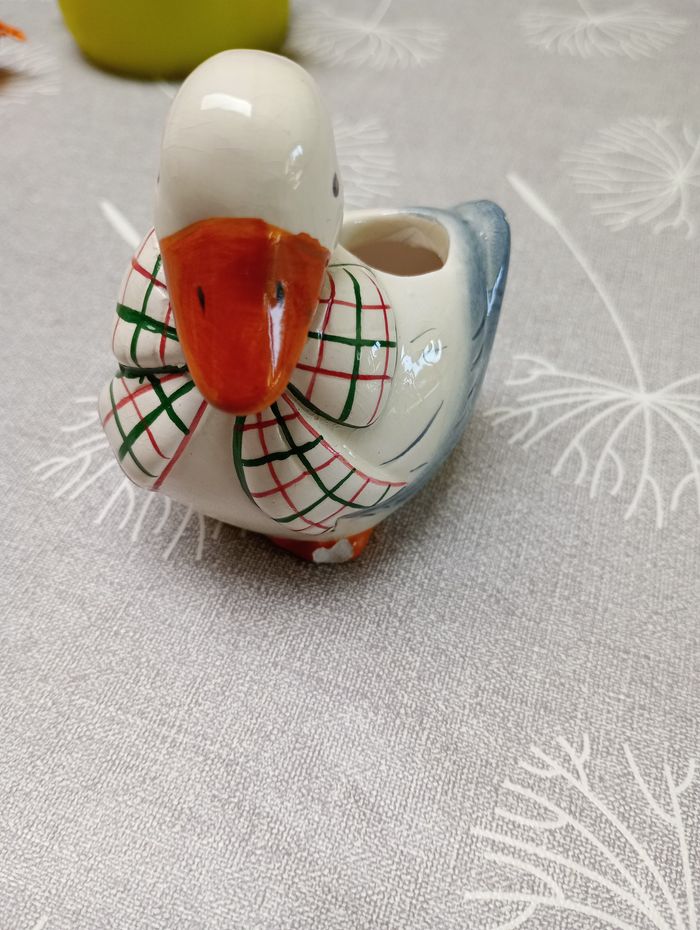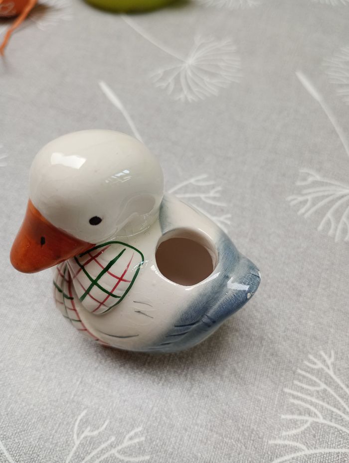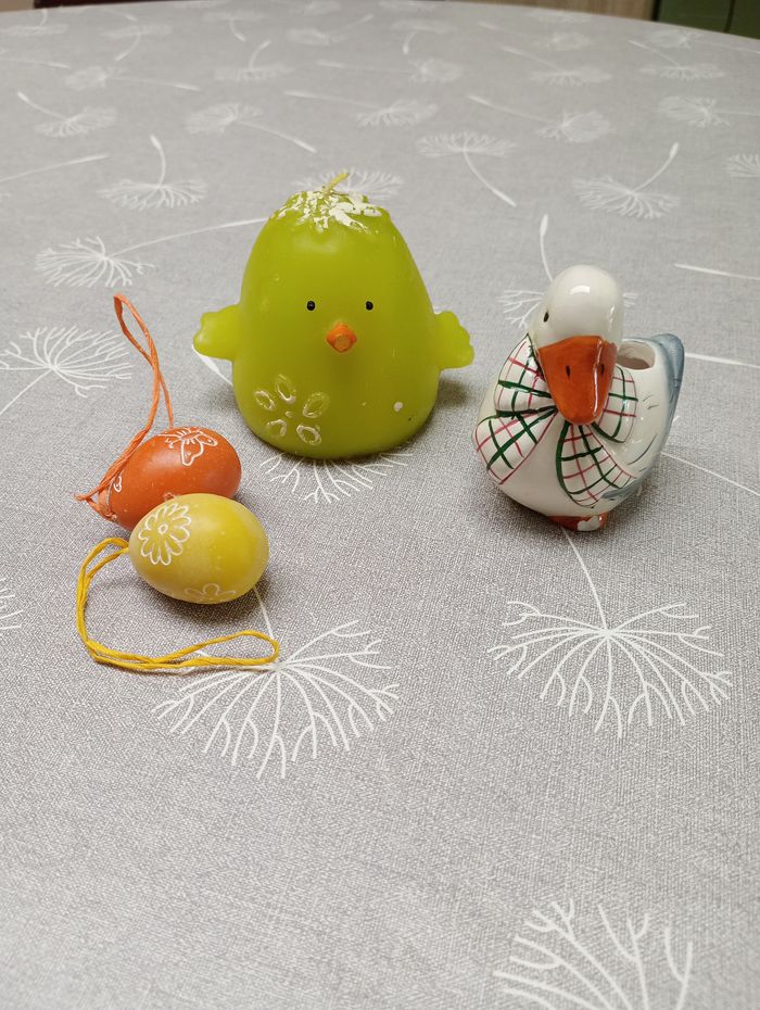 Lot de décoration pour Pâques. Comprenant : Une grande bougie poussin neuve (7 cm). Deux œufs en céramique pleins. Une oie, léger coup sur le pied devant (6 cm).