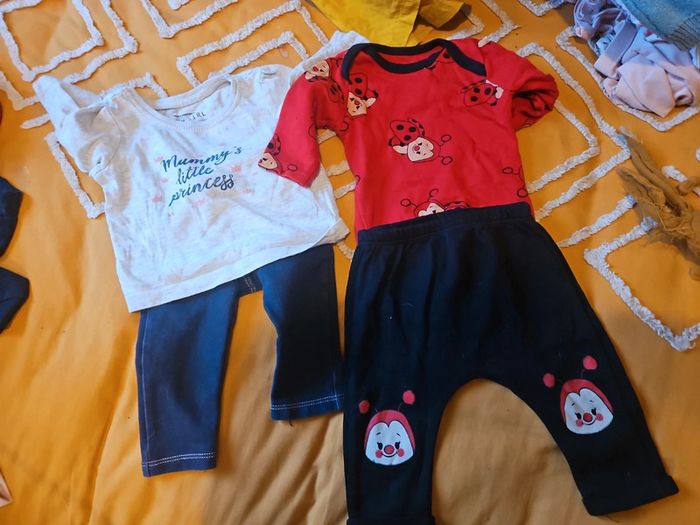 1 tenue avec t-shirt manches longues et jeggins 1 pantalon molletonné et body coccinelle D'autres pièces en 3,6,9,12,18 et 24mois