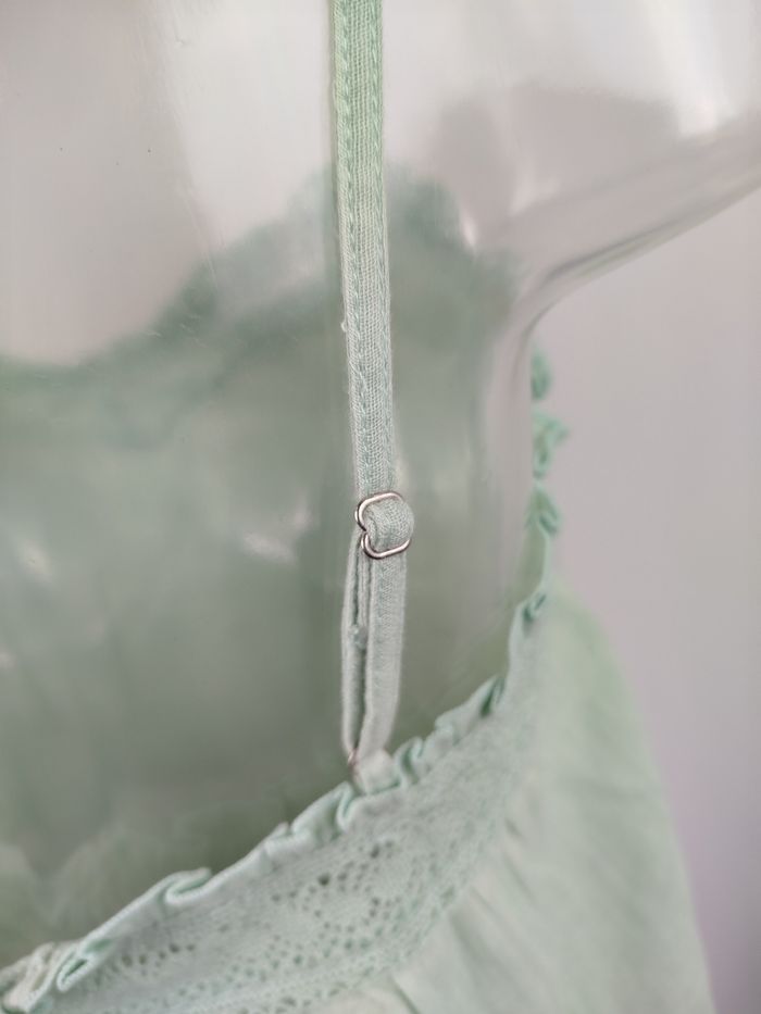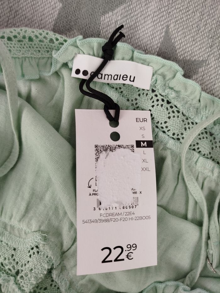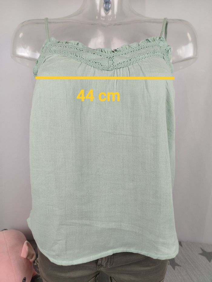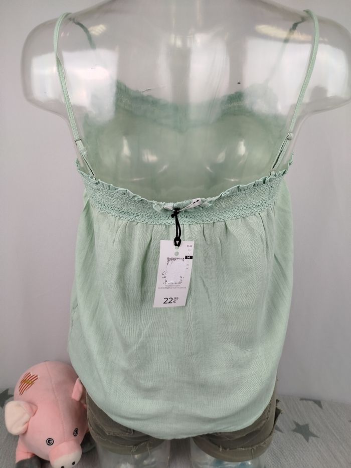 Envoi rapide ✈️ et soigné 🫧 Pour les lots contactez moi 🛍️ Tout est négociable 💰 Je réponds rapidement 📨 Pensez à visiter mon dressing Top court blouse débardeur femme de la marque camaïeu Coloris vert d'eau 100% coton Bretelles réglables Taille 2/M/38-40 Jamais porté avec étiquette d'origine