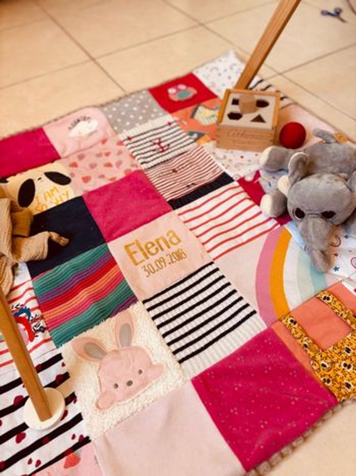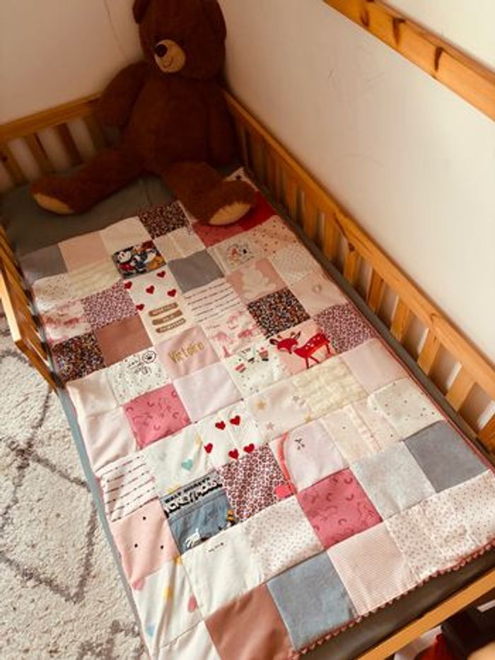 Hello, couturière créatrice je vous propose de transformer les vêtements de vos bébés en une merveilleuse couverture souvenir ! Taille 100x150 cm : 190€