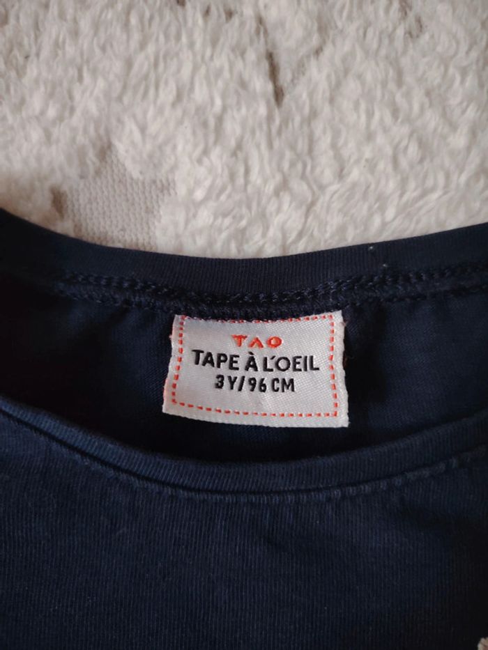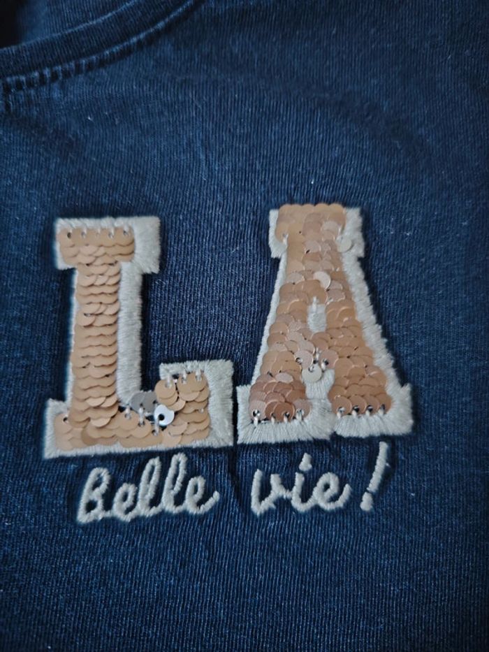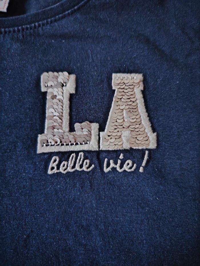 T-shirt ML Tape à l'œil, marine, avec broderie La belle Vie sur la poitrine avec des sequins réversibles (doré ou argenté). Peu porté, il est en très bon état. D'autres articles en 3 ans par ici : #fille3anselpi2201