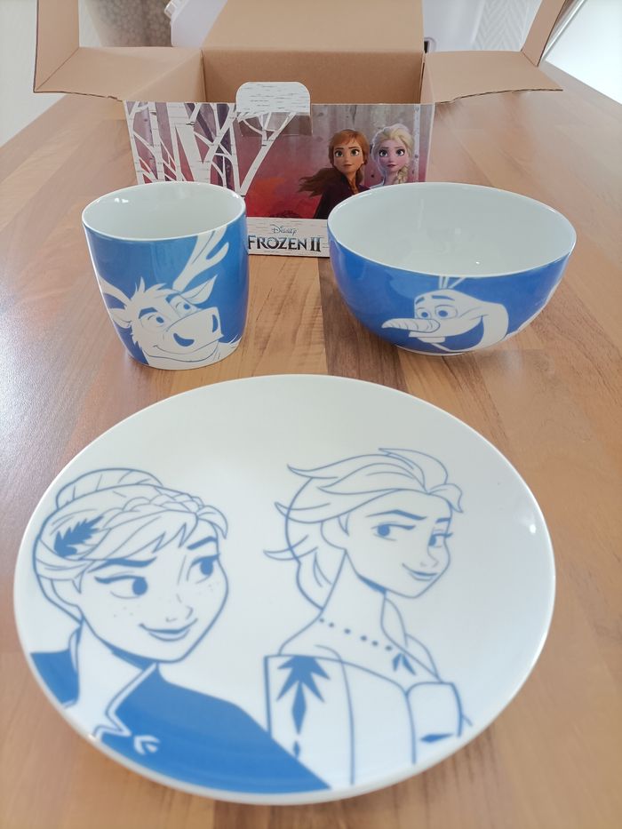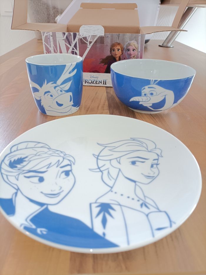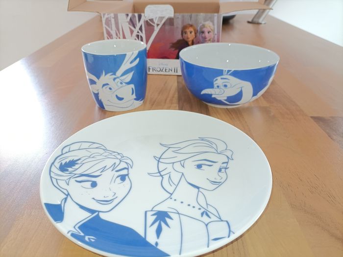 Lot vaisselle neuf petit déjeuner reine des neiges blanc et bleu : tasse, bol et assiette - photo numéro 1