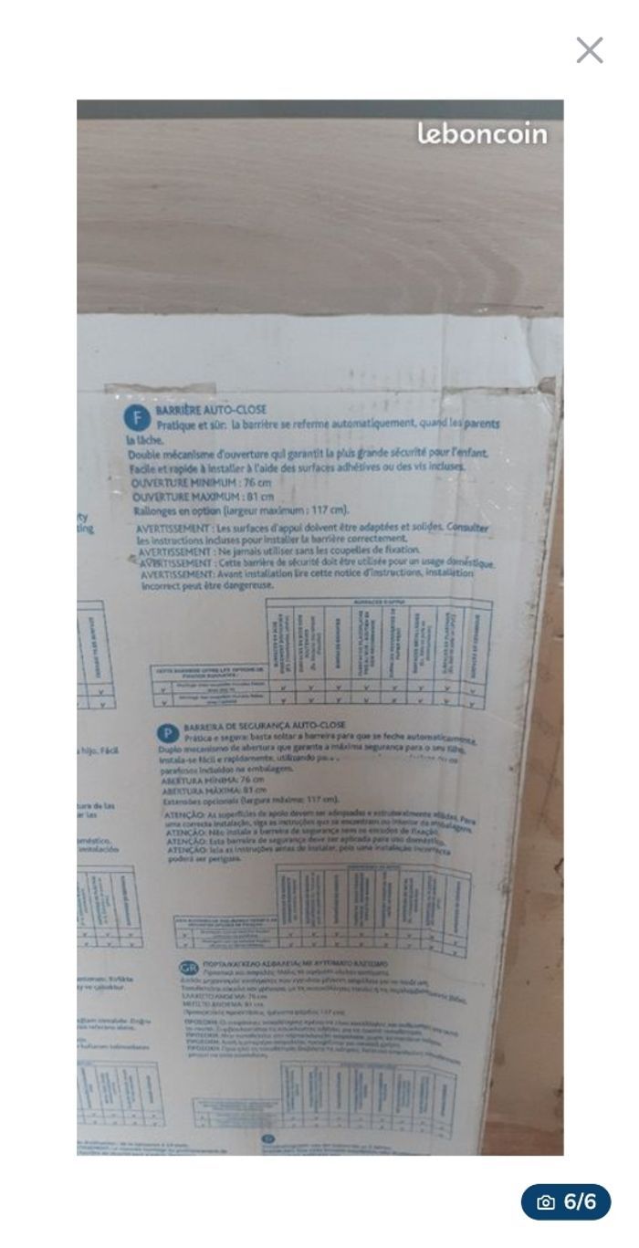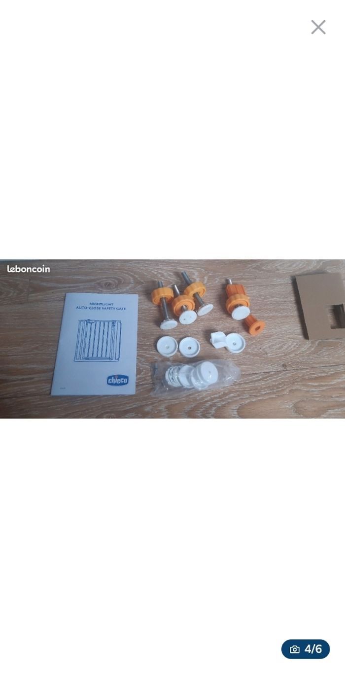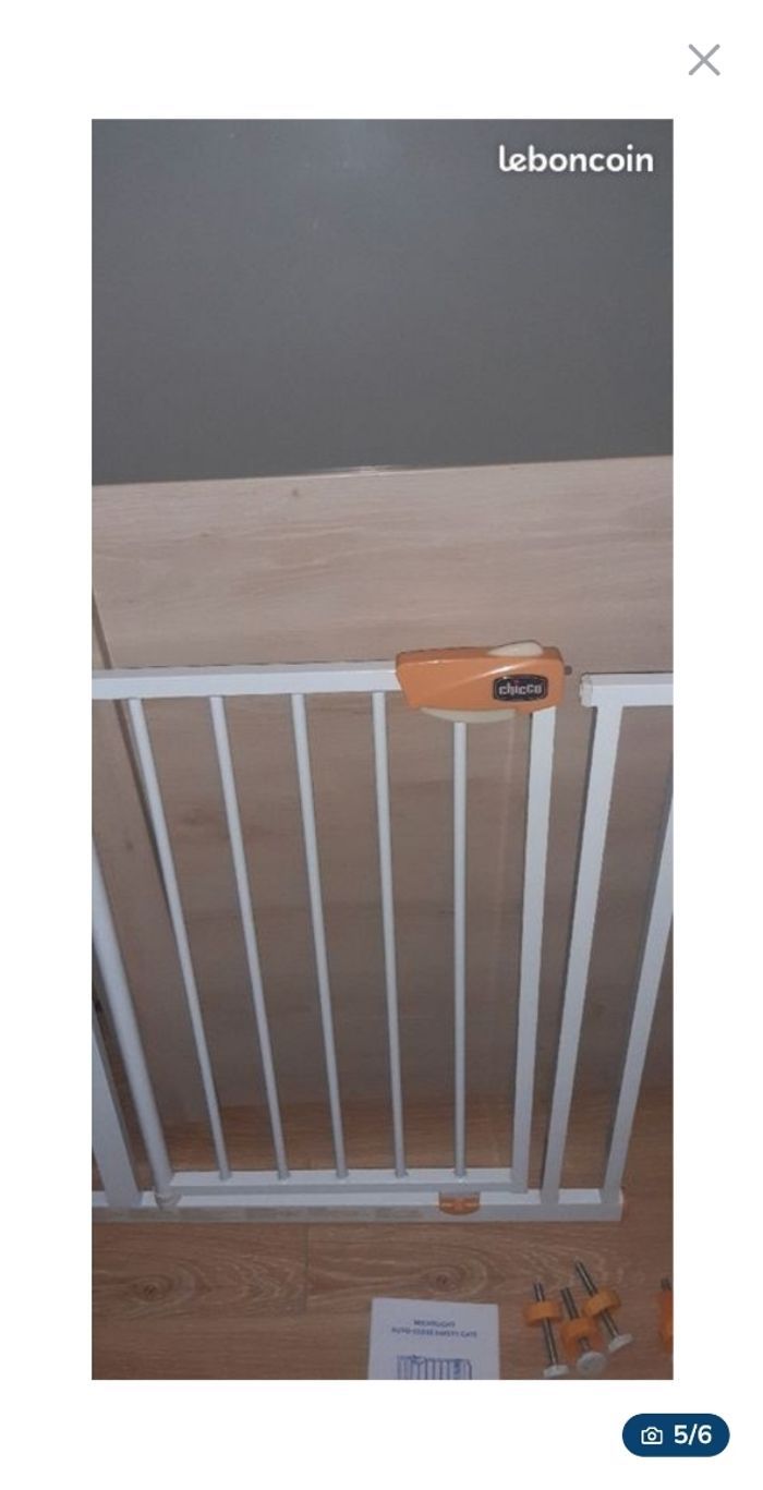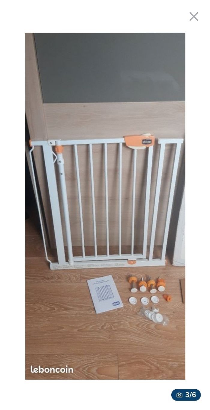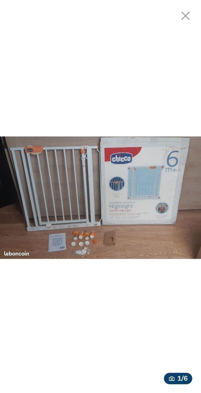 JE N'ACCEPTE PAS D'OFFRE MERCI Barrière de sécurité enfant / bébé Barrière d'escalier ou espace de danger / anti-chutes chicco night light Pratique et sûr, la barrièrese referme automatiquement quand les parents la lâche. Double mécanisme d'ouverture qui garantit la plus grande sécurité pour l'enfant. Facile et rapide à installer à l'aide des surfaces adhésives ou des vis incluses. Espace minimal entre 2 murs 76, maximum 81 cm. La poignée est lumineuse la nuit (fluorescente). Elle a des traces de peinture blanche sur un côté de la poignée. Elle reste en très bon état Vendue complète avec carton d'origine, mode d'emploi et l'ensemble de ses pièces. Remise en main propre à 5min d'Aubigny en Artois ou sur Arras. Envoi possible après un règlement sécurisé via le site merci