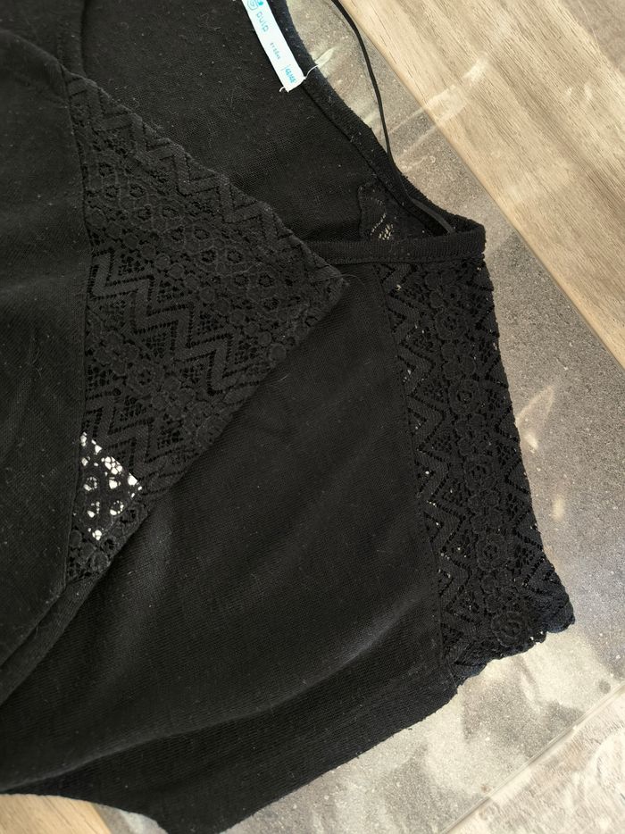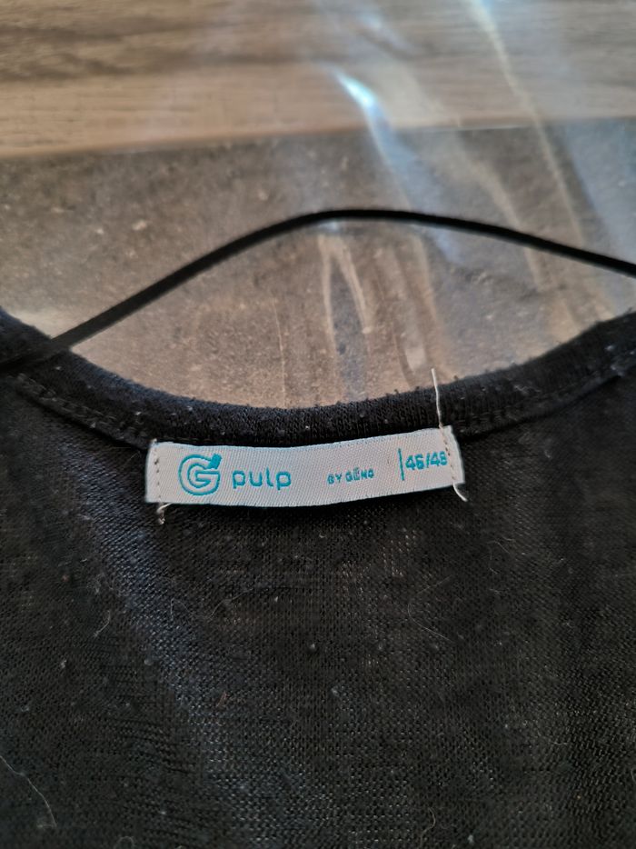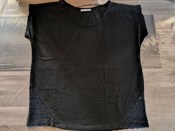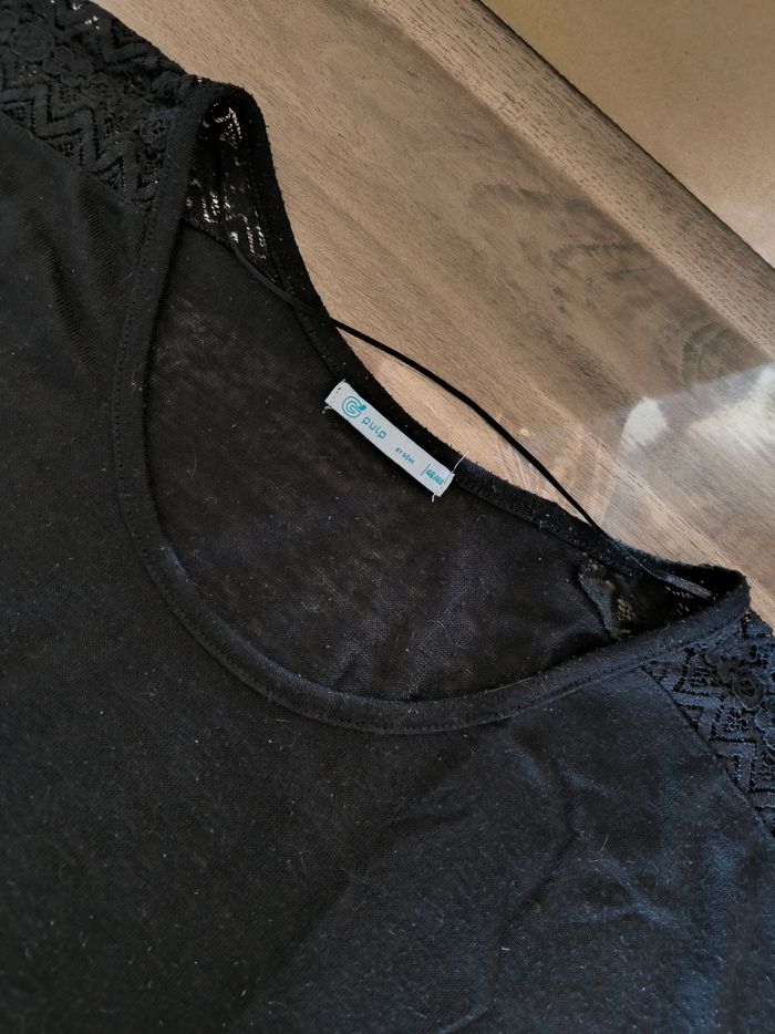 T-shirt à manches courtes Marque Pulp by Gémo Taille 46-48 • Coloris noir • Col rond • Broderie/Dentelle aux épaules et bas du t-shirt • Tissu fin, stretch • Bouloché Largeur aisselle à aisselle non étirée : 61 cm Largeur aisselle à aisselle étirée au maximum : 88 cm Longueur totale : 68 cm Longueur aisselle : 42 cm En bon état à cause des bouloches #evelyne_taille_46 #evelyne_taille_48