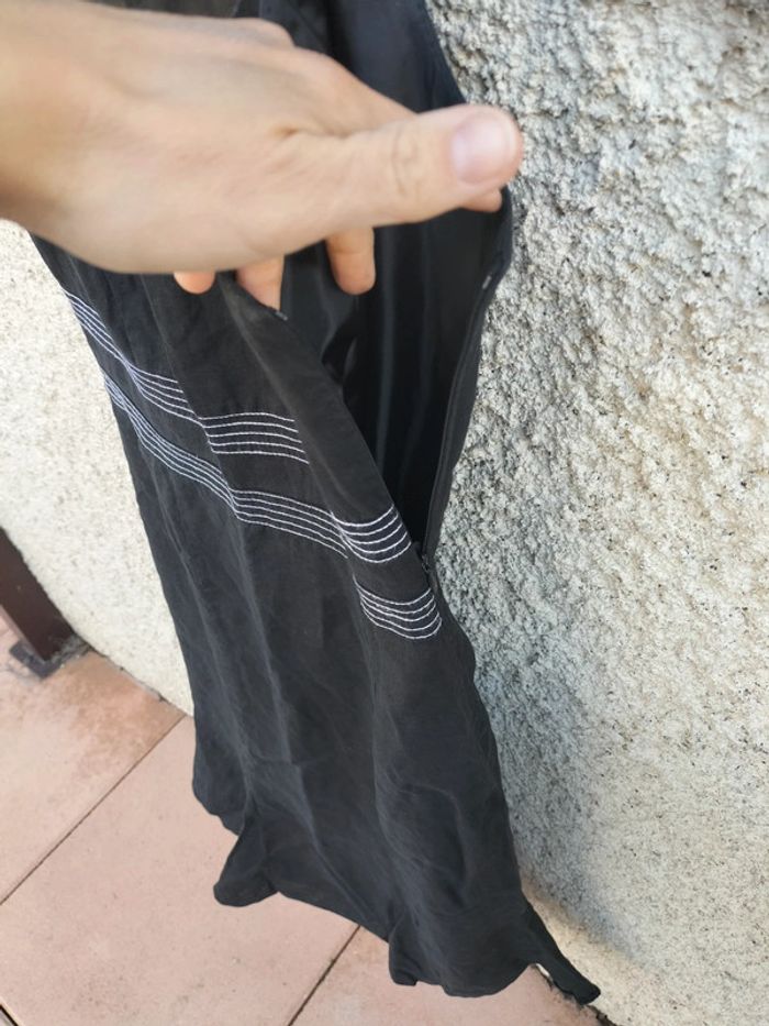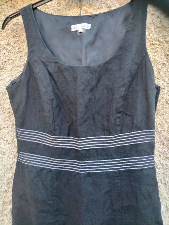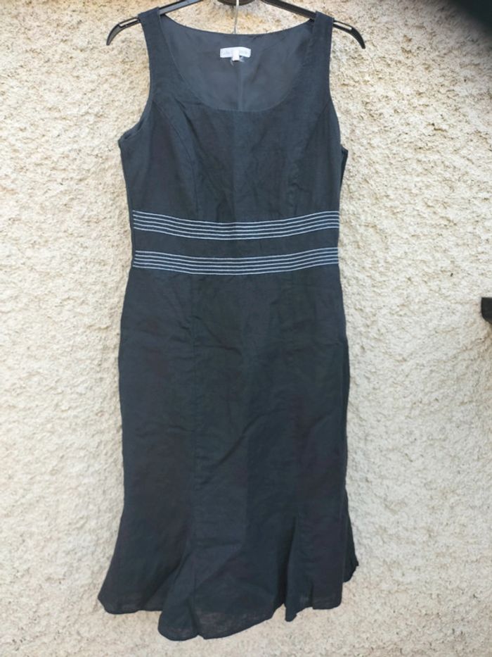 Robe longue noir Julie Guerlande en lin. Doublée Taille 38 2 bandes de surpiqûres blanches faisant la beauté de la robe. Légèrement évasée sur le bas. Fermeture éclair sur le côté gauche. #robe #robelongue #robesansmanches #julieguerlande #38 #taille38 #lin #printemps #ete #automne #hiver