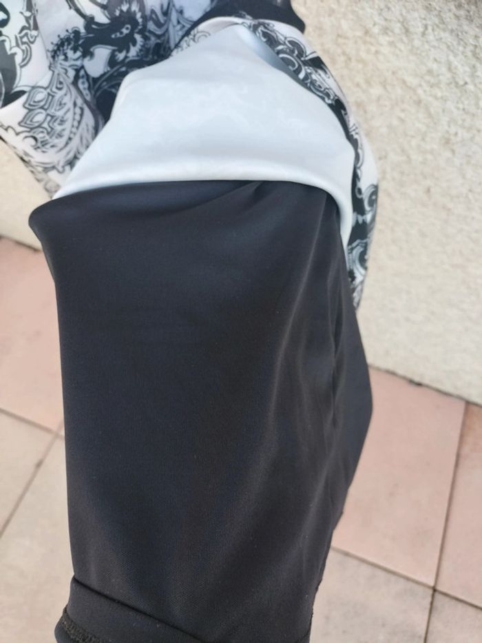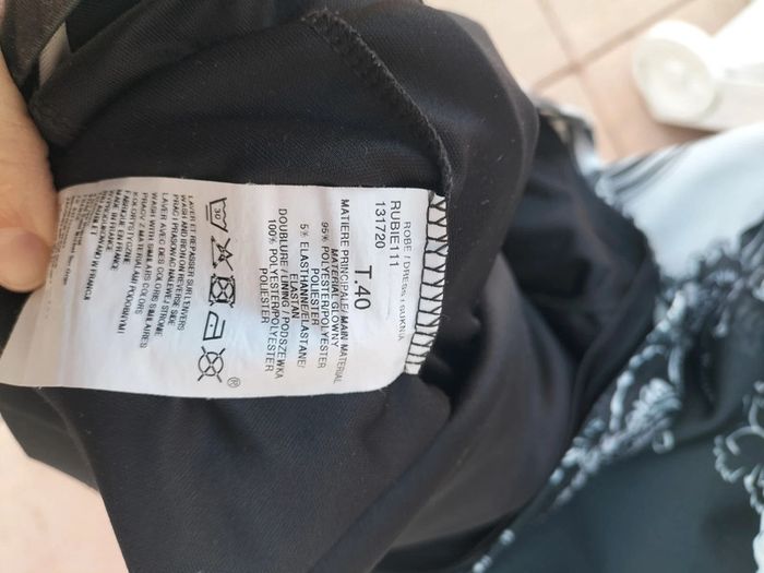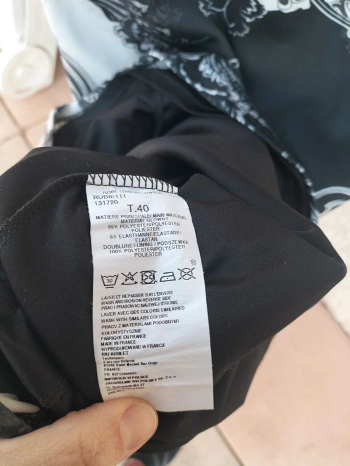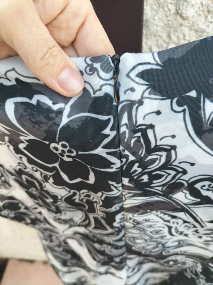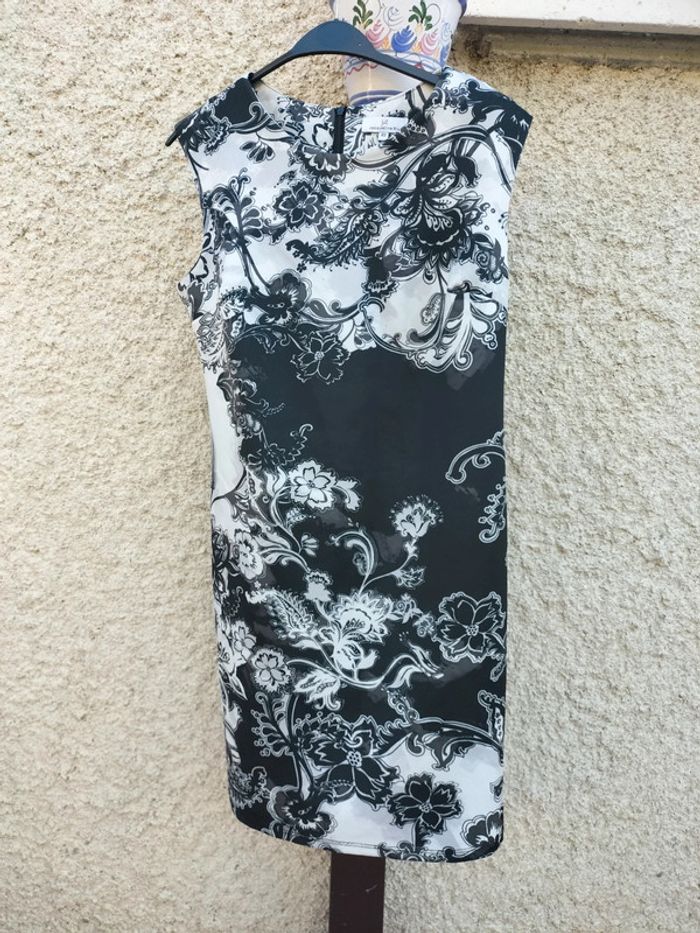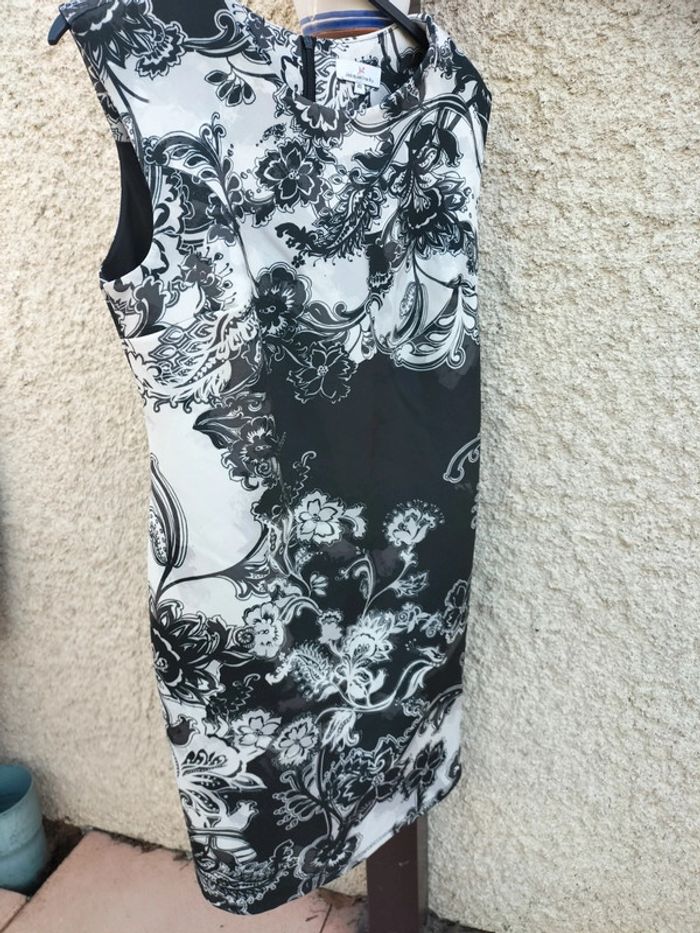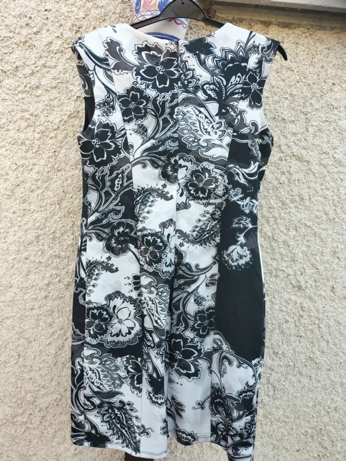 Robe doublée sans manches Présence d'épaulettes. Tissu épais avec doublure. Fermeture éclair dans le dos. Très beau motif. #robe #noir #blanc #jacquelineriu #taille40 #40 #mariage #ceremonie