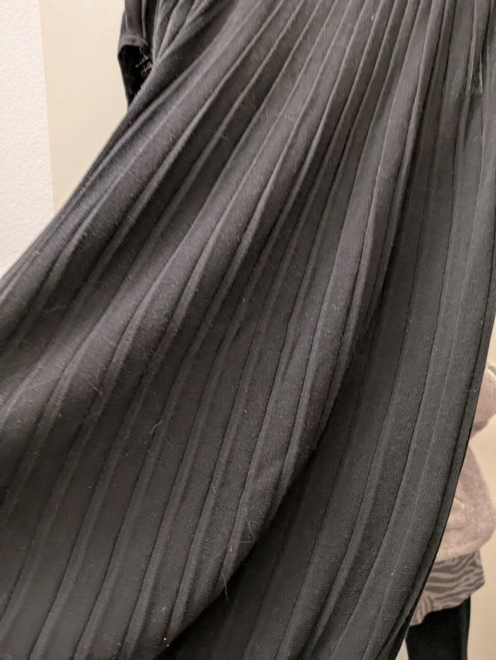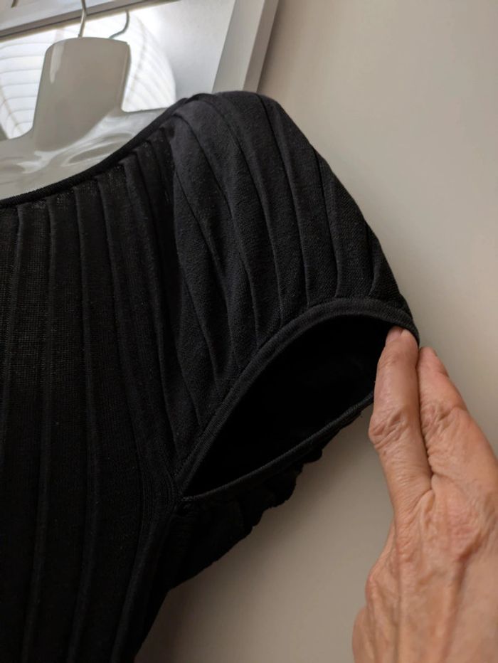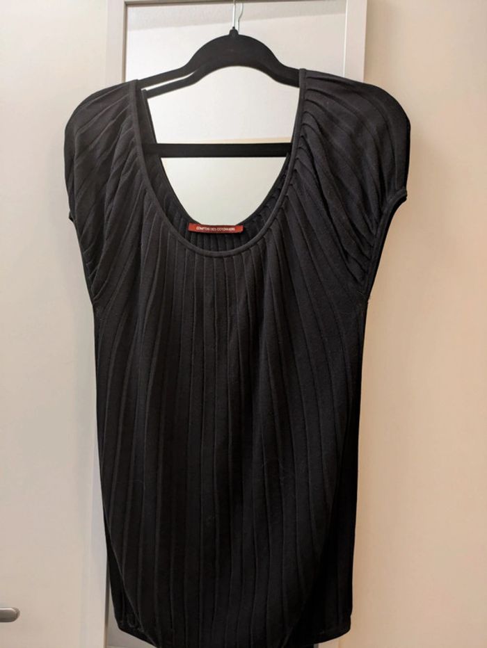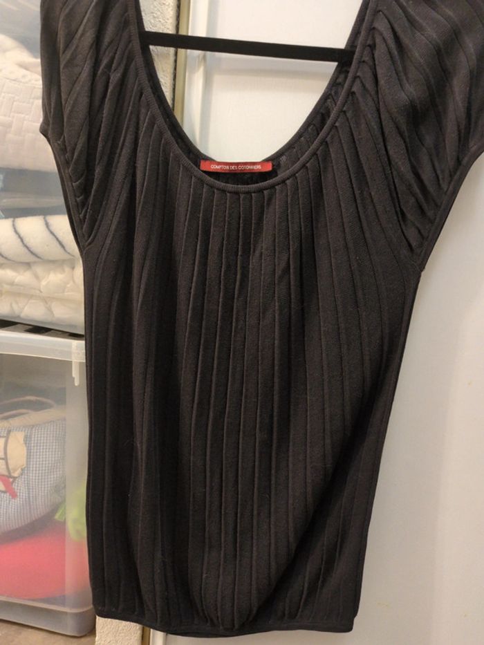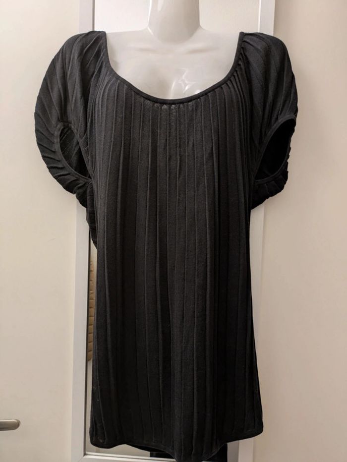Mesures 36/42/76. T shirt plissé resserré en bas, très beau décolleté, manches courtes. Couleur gris taupe, ou aubergine, difficile à définir.