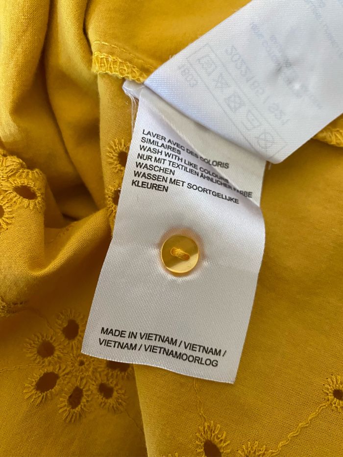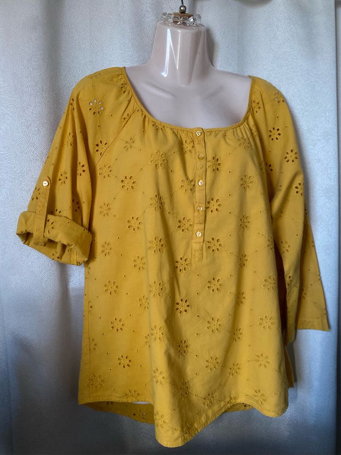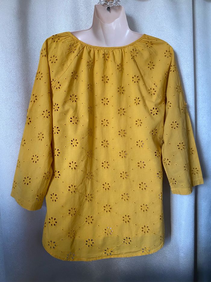 Tunique manches 3/4, jaune moutarde broderies anglaise Patte boutonnée sur l’encolure ( un bouton de rechange en doublure) Patte bouton pour faire des revers aux manches Entièrement doublé sur le devant 100% coton Taille 42 Aisselle à aisselle 55,5 cm Longueur dessous de manche 36 cm Largeur à plat taille 52,5 cm Tout en bas à plat 57,5 cm coupe Liquette, plus long derrière que devant Longueur devant 67,3 cm, longueur dos 70 cm