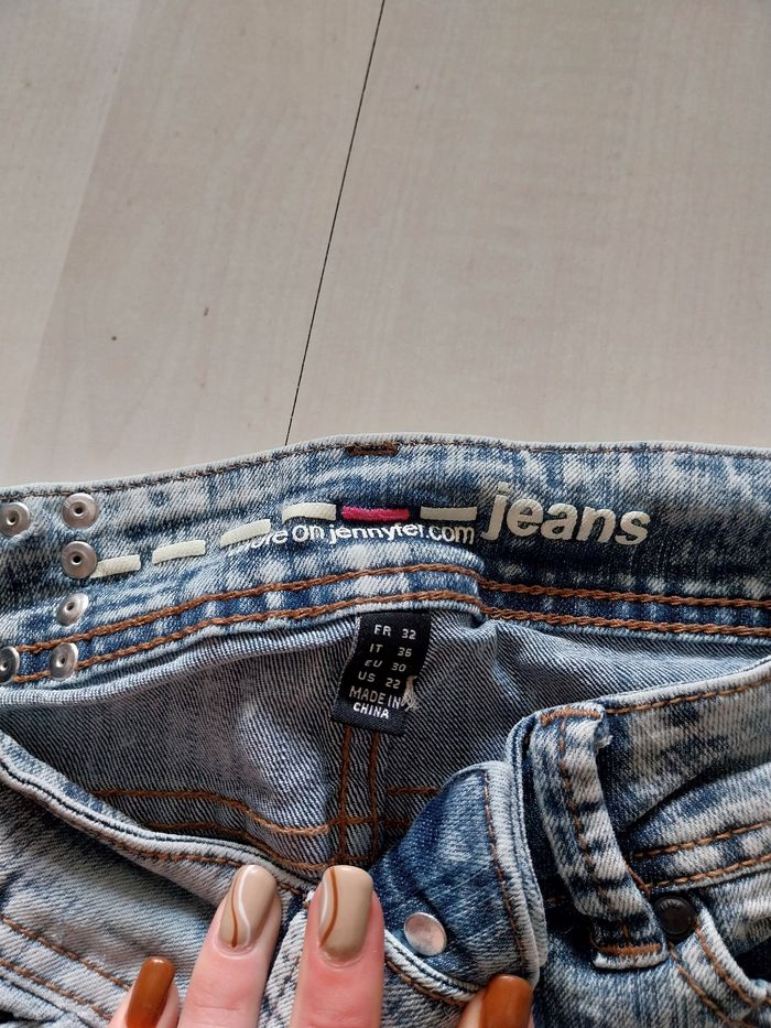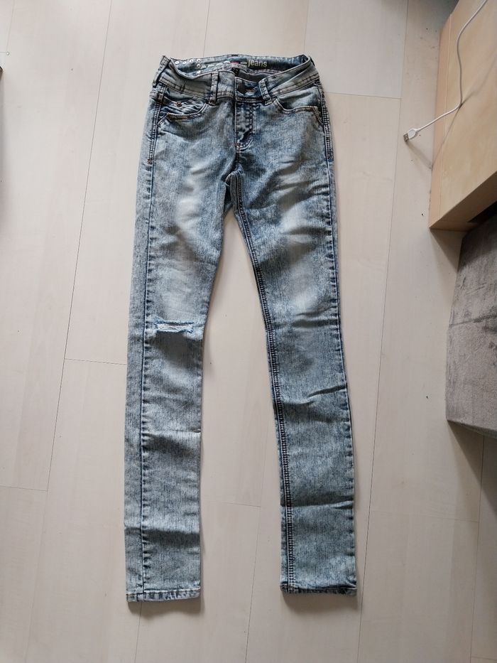 Bonjour, Je vends ce jean femme bleu clair effet troué. Il est en taille 32 de la marque Jennifer.