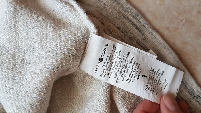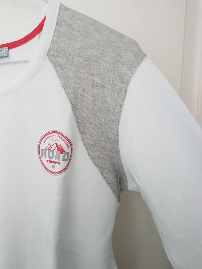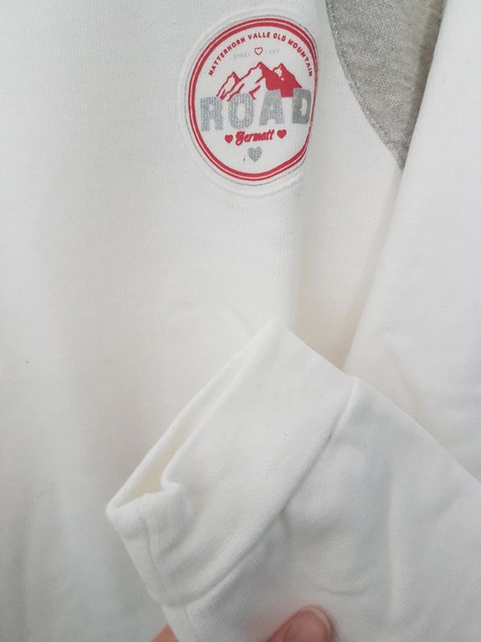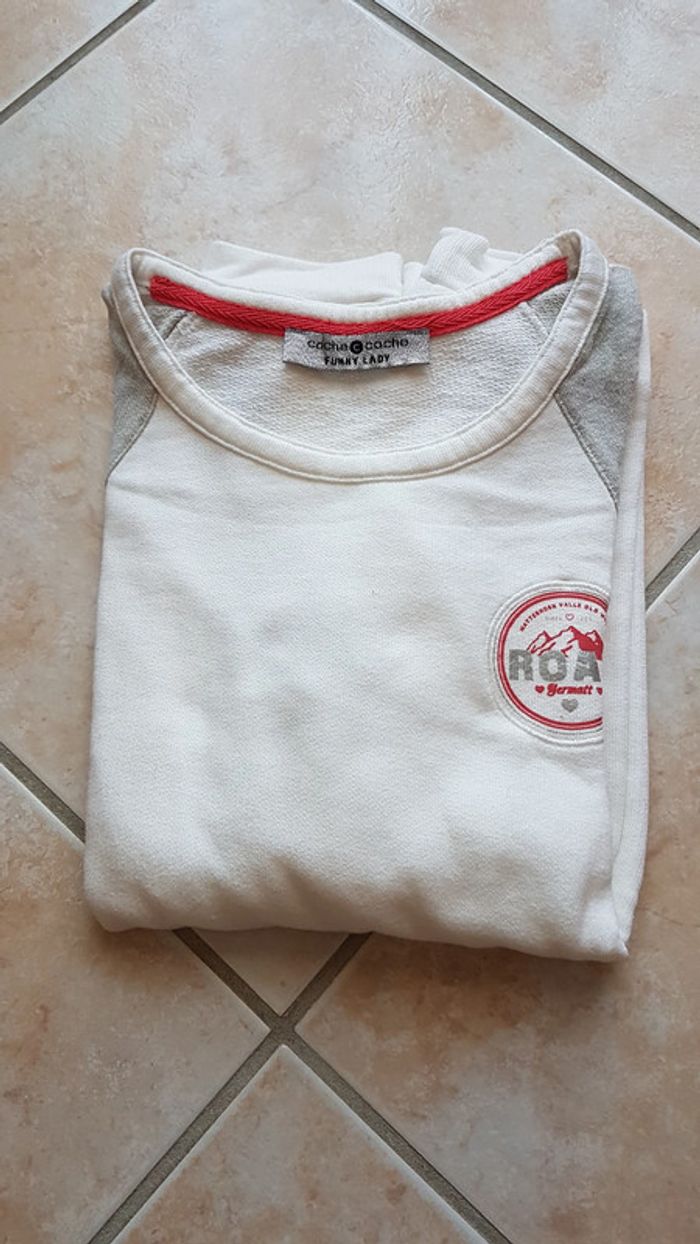 Sweat léger de cache-cache Blanc, haut des épaules gris, motif écusson sur la poitrine. Plus d'étiquette mais il s'agit d'une taille 1 #SILVVêtementsFtS