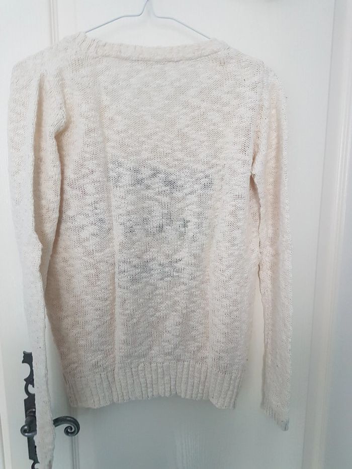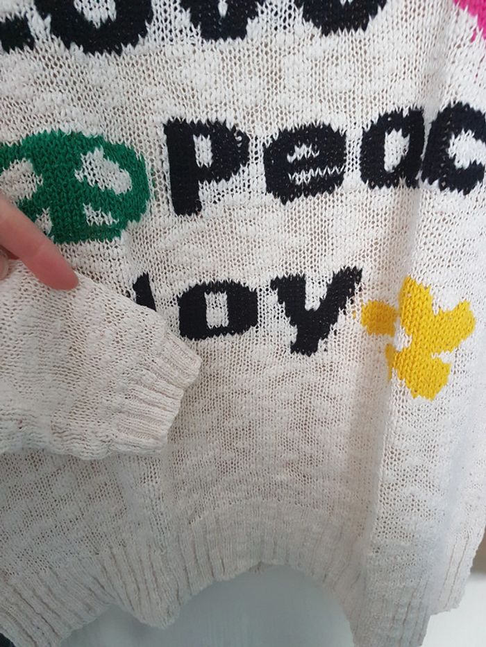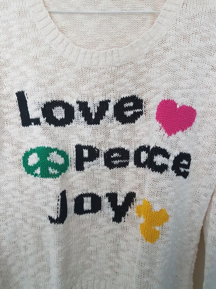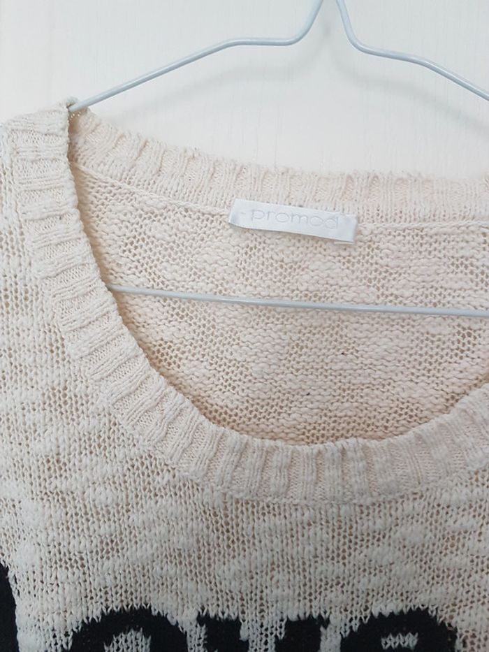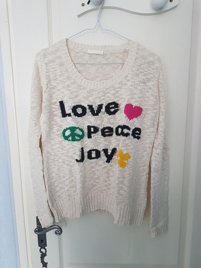 Pull beige Promod Message Love peace joy en noir avec symboles Légèrement transparent Etiquette coupée mais il s'agit d'une taille S #SILVVêtementsFtS