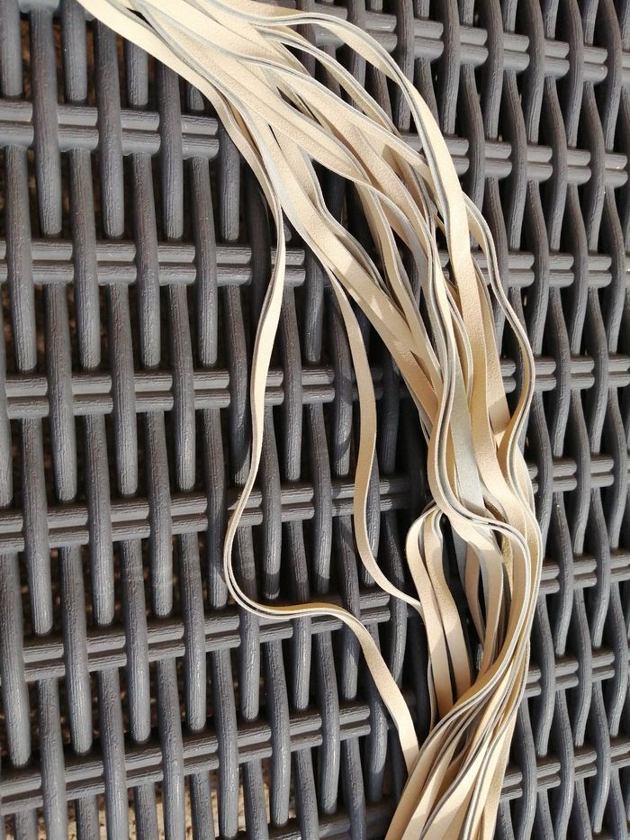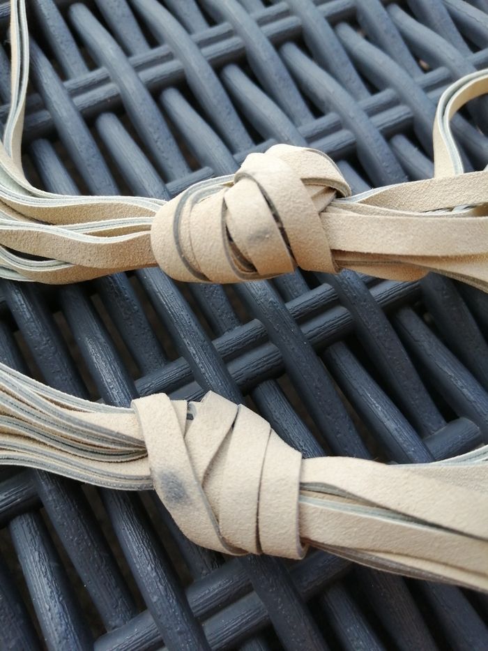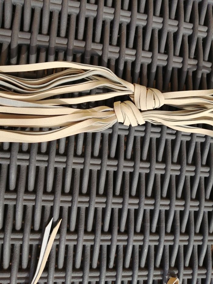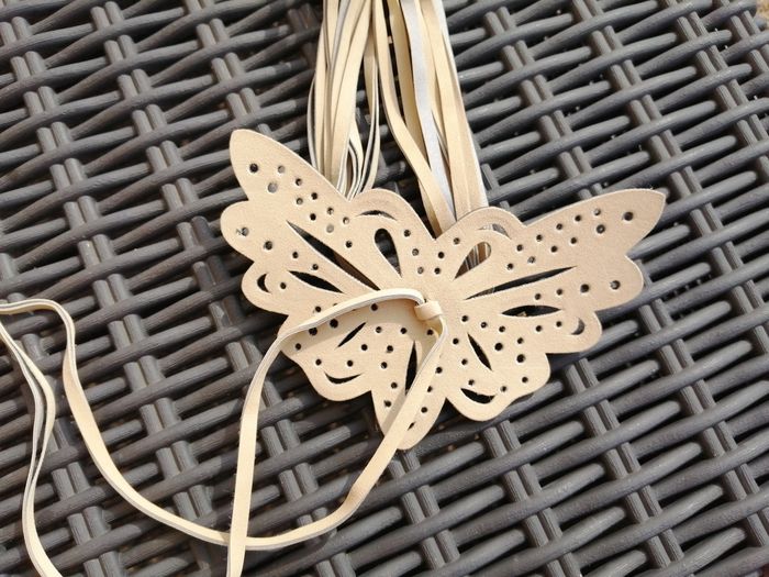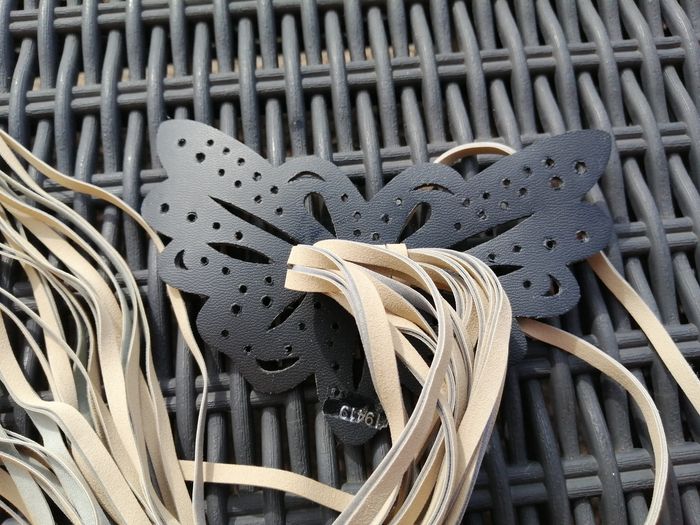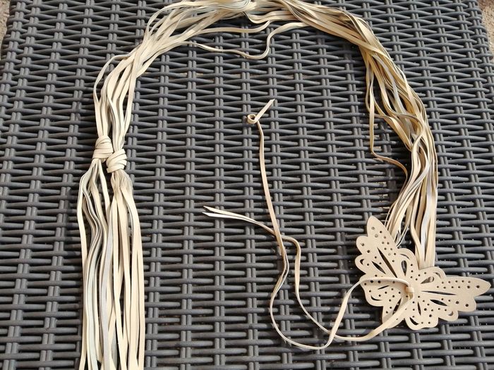 Longueur totale de la ceinture : 220 cm Dimensions papillon : 7x 14 cm De coloris beige crème (lanières se décollent, 2 traces noires dû au stockage, rien mis dessus) Jamais porté