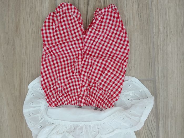 Ensemble composé d'un pantalon en vichy rouge agréable à porter (ne serre pas) et d'un tee shirt blanc agrémenté de broderie anglaise en bas avec écriture small girl en lacet rouge