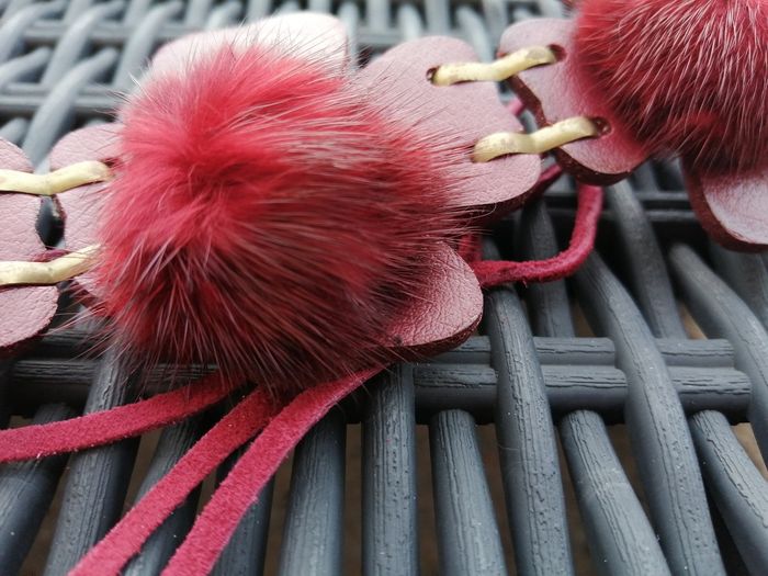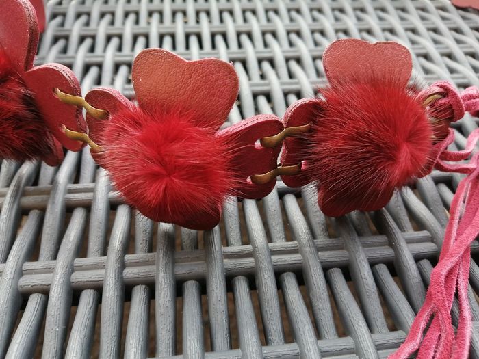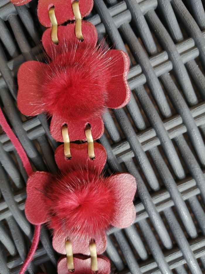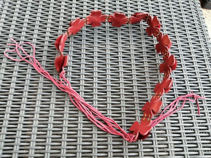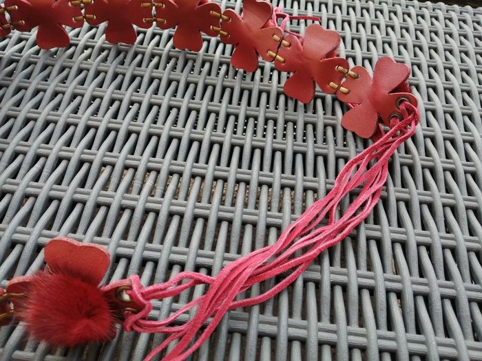 Longueur totale de la ceinture : 165 cm Longueur ceinture sans lanières : 73 cm Dimensions motif : 6x 6 cm De coloris rouge bordeaux (bords qui collent, motifs qui se décollent, motifs portant des traces, 1 ponpon qui se décolle, dû au stockage, rien mis dessus, voir photos) Jamais porté