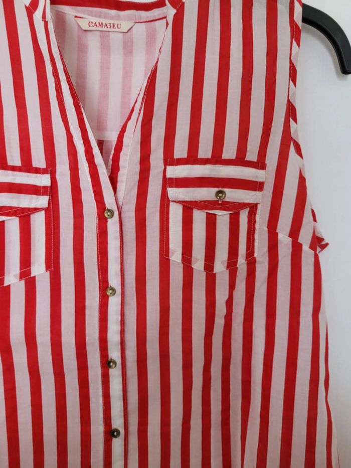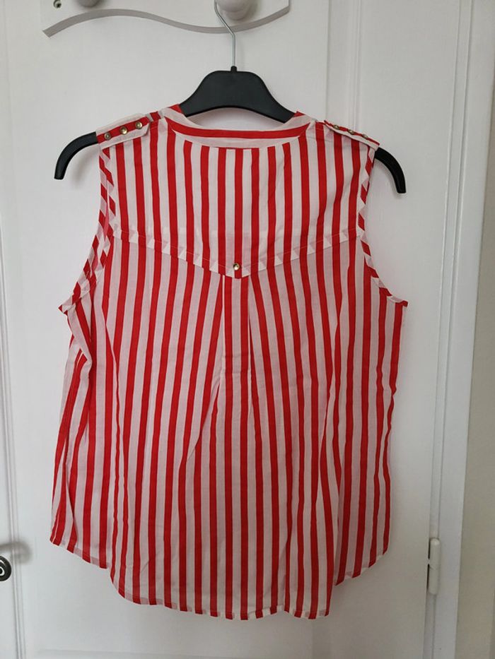 Débardeur blanc et rouge avec lignes verticales et horizontales camaïeu Col V Poches, boutons Etiquette coupée mais il s'agit d'une taille M (voir mesures dernière photo) #SILVVêtementsFtM