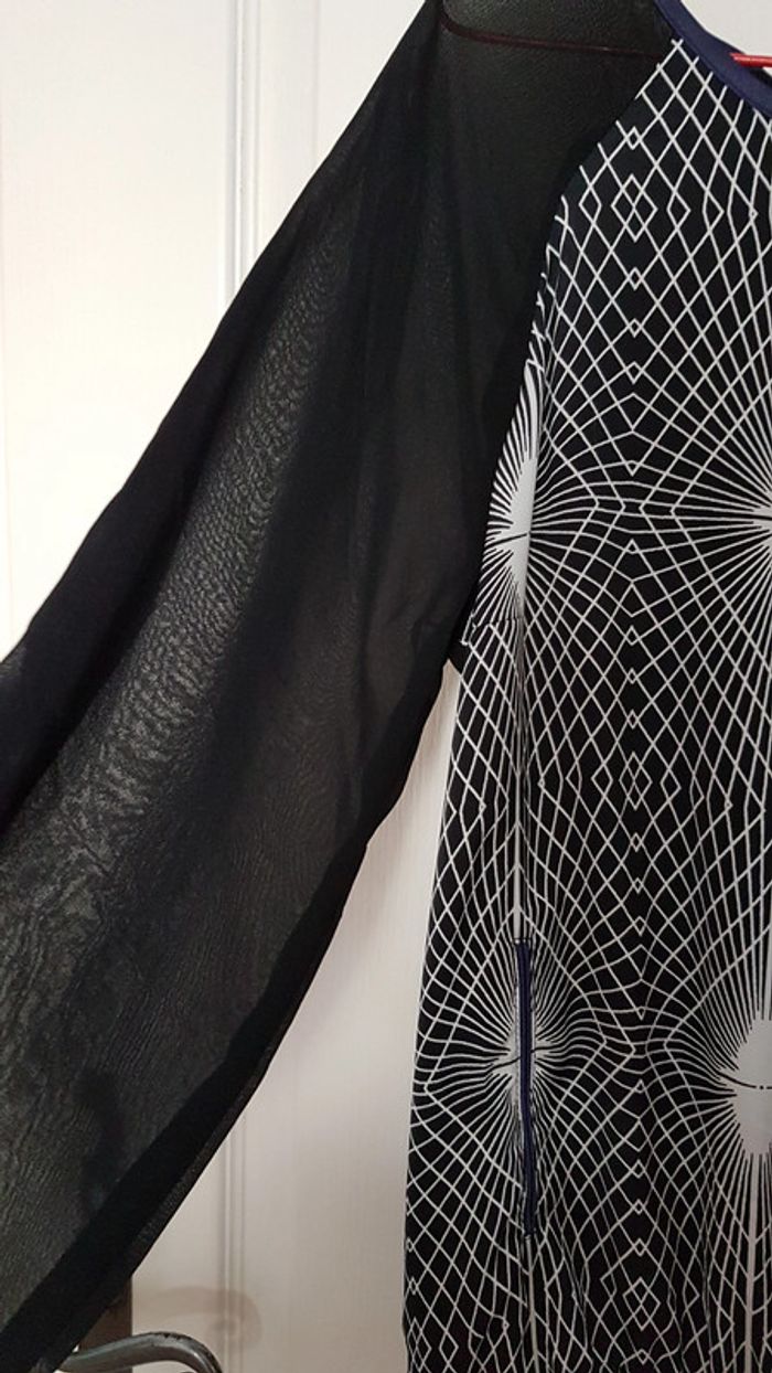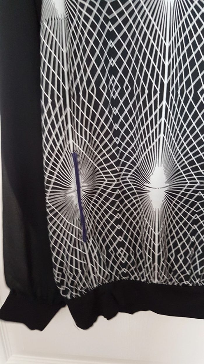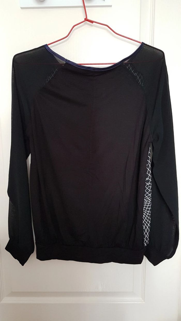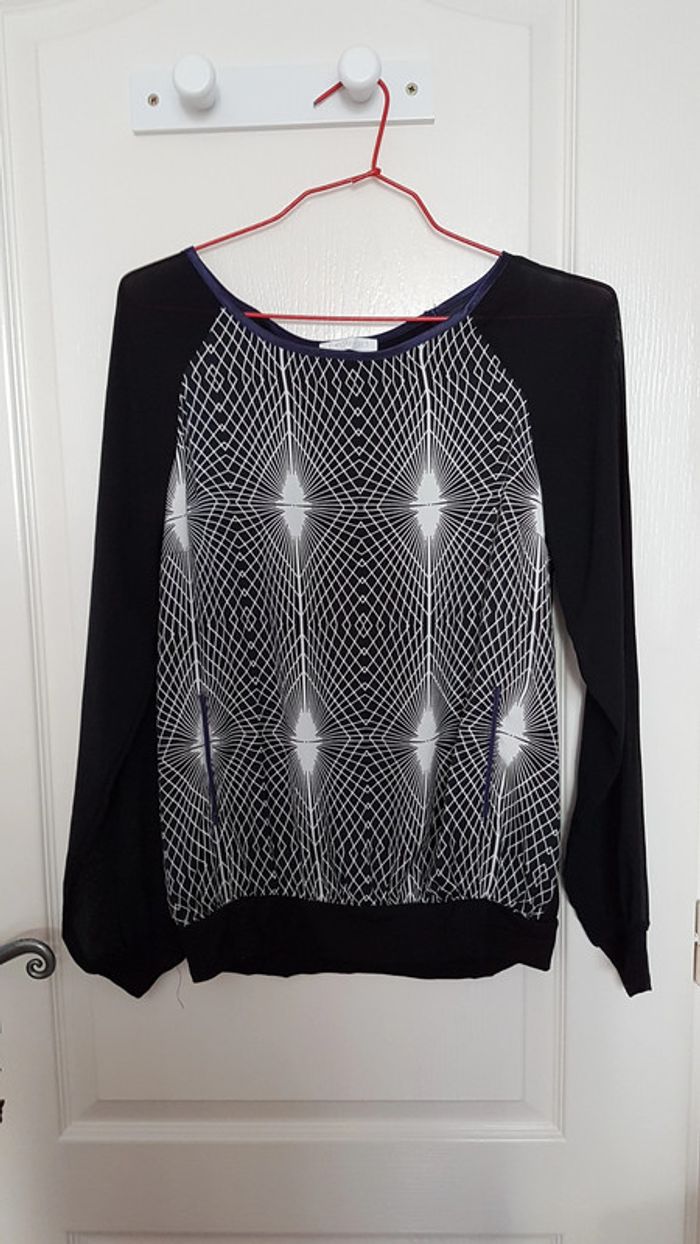 Pull léger fluide type blouse Promod Taille 2 Noir, motif blanc sur le devant Viscose, élasthanne. Col violet, fausses poches violettes. #SILVVêtementsFtM