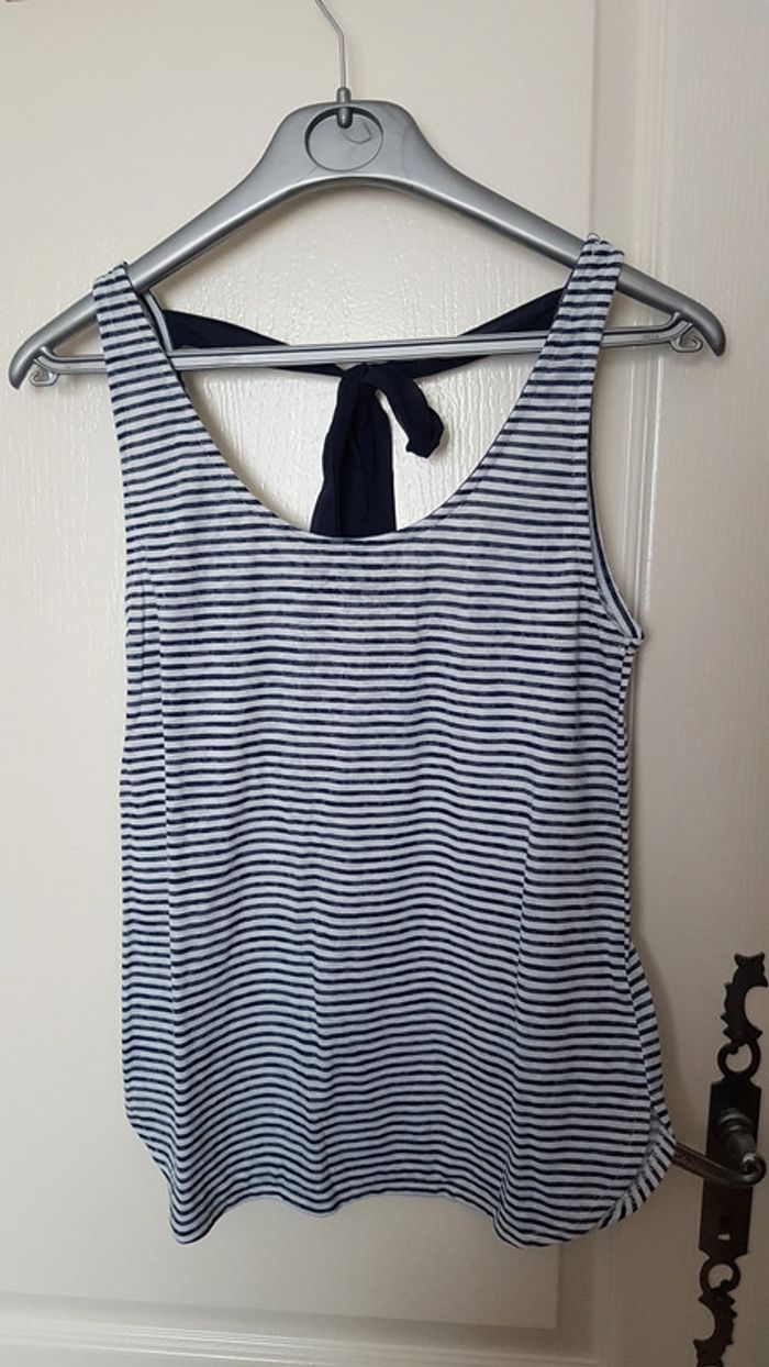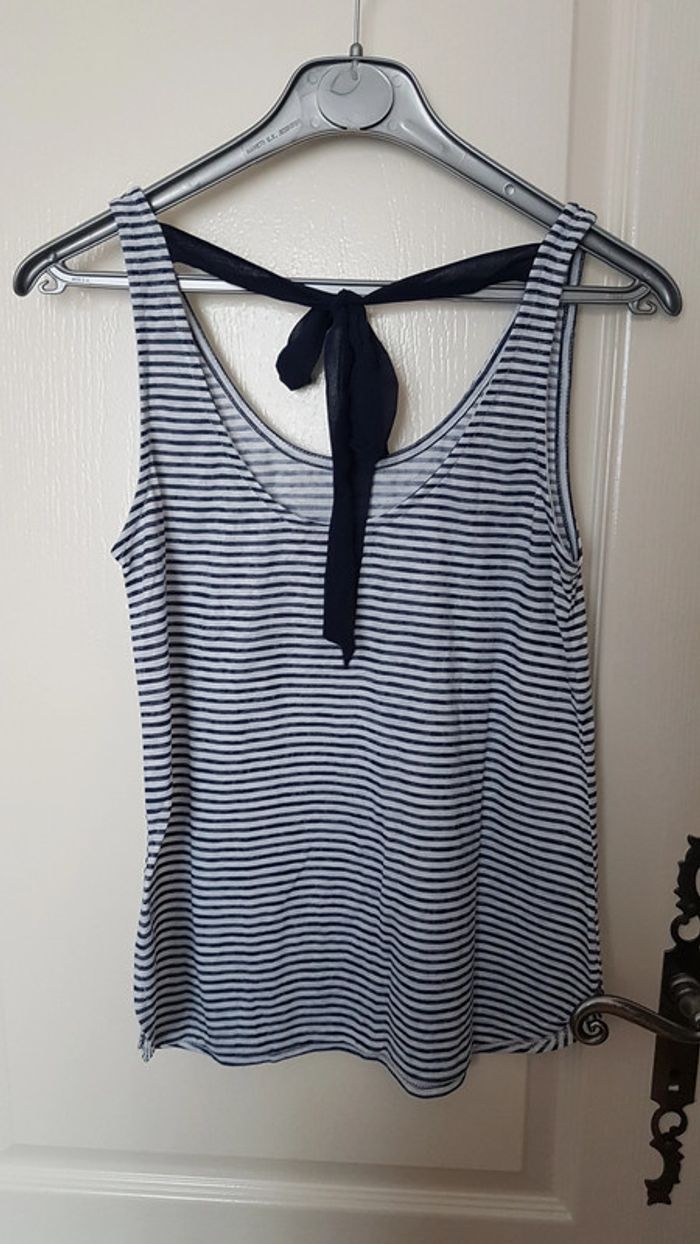 Débardeur à rayures bleu et blanc camaïeu Noeud à attacher sur la nuque Etiquette coupée mais il s'agit d'une taille S #SILVVêtementsFtS