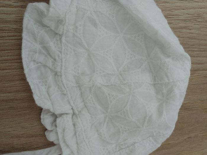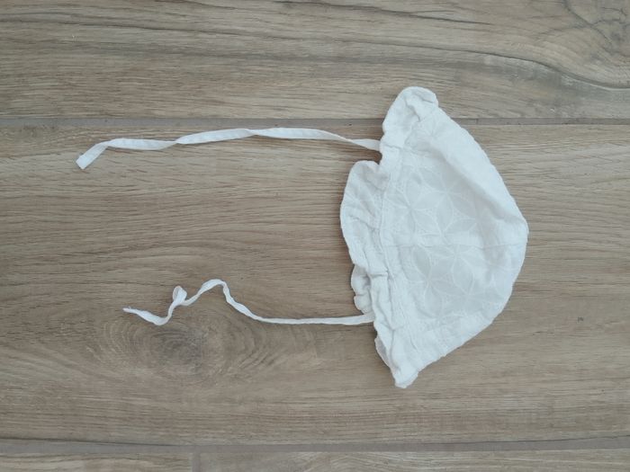 Joli bob blanc en taille 2-4 mois selon la marque. Possibilité de lacer le bob dans le cou.