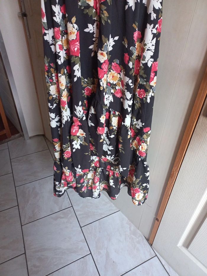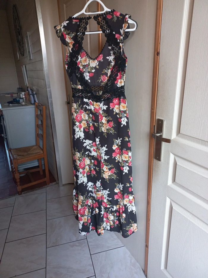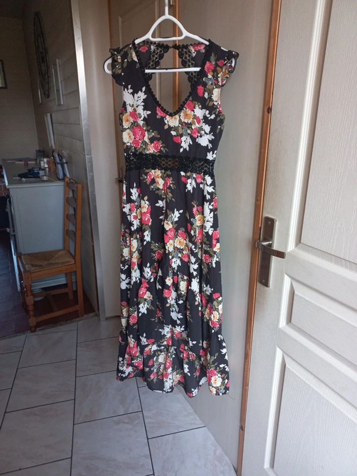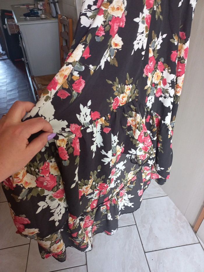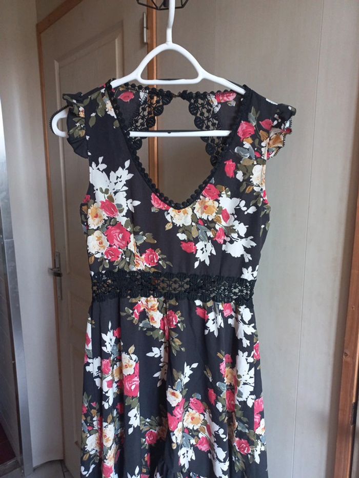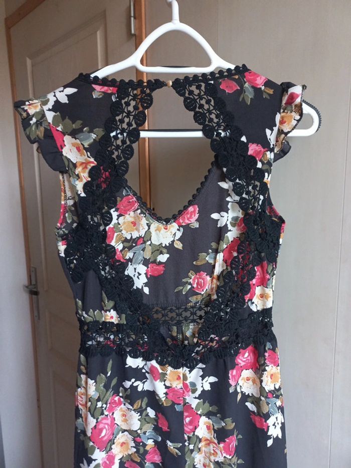 Robe noire imprimée fleurs Plus courte devant Dos nu Aisselle à aisselle 40 cm