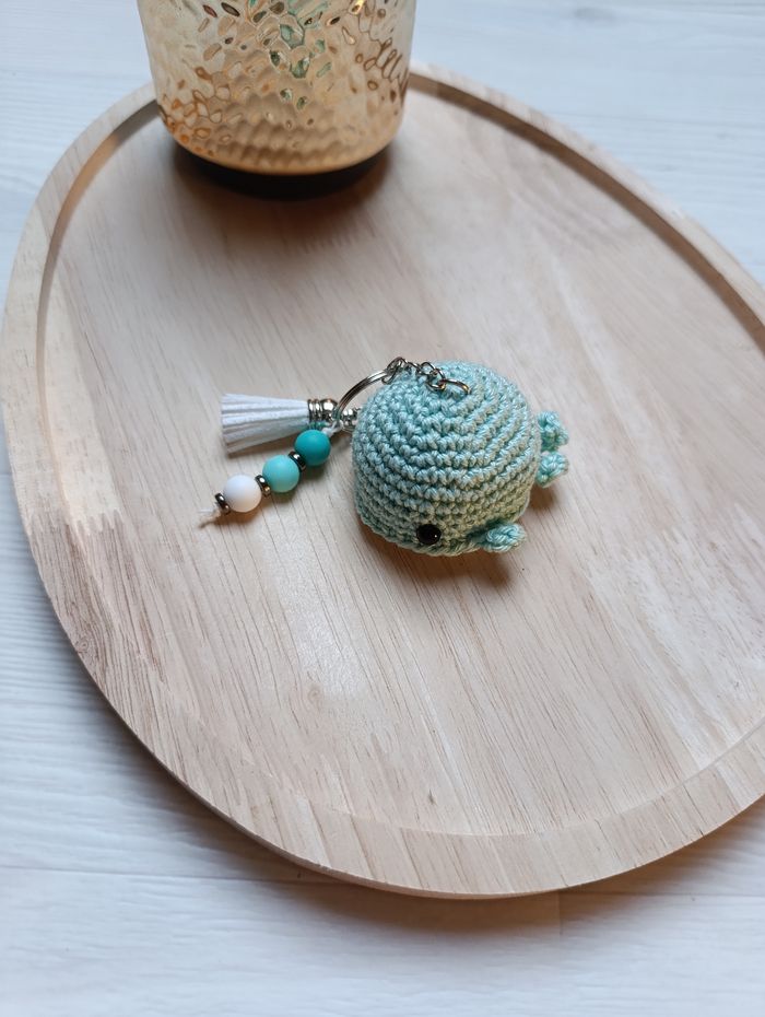Porte clé baleine au crochet Vous pouvez choisir d'autres coloris Possibilité de mettre un prénom sur la ligne de perles