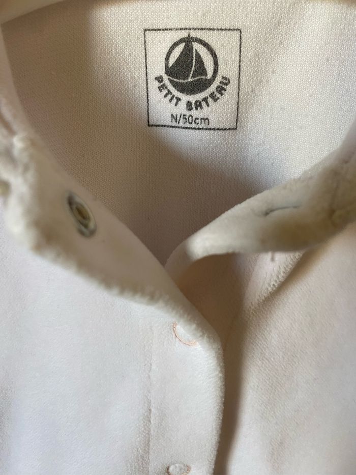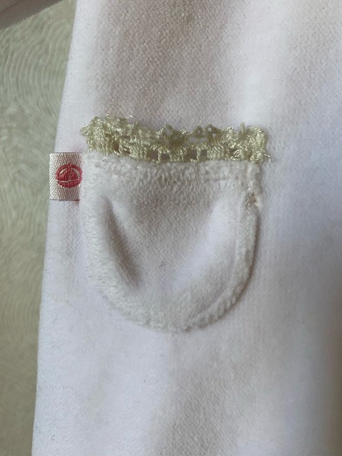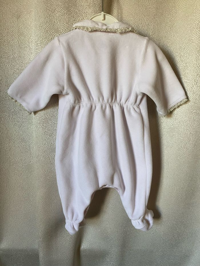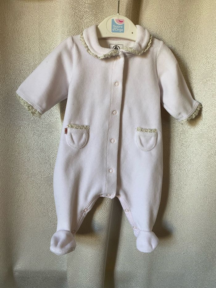 Superbe pyjama velours rose tendre bordures dentelle écrue Col Claudine Ouverture devant 2 poches Taille Naissance 50 cm Petit Bateau