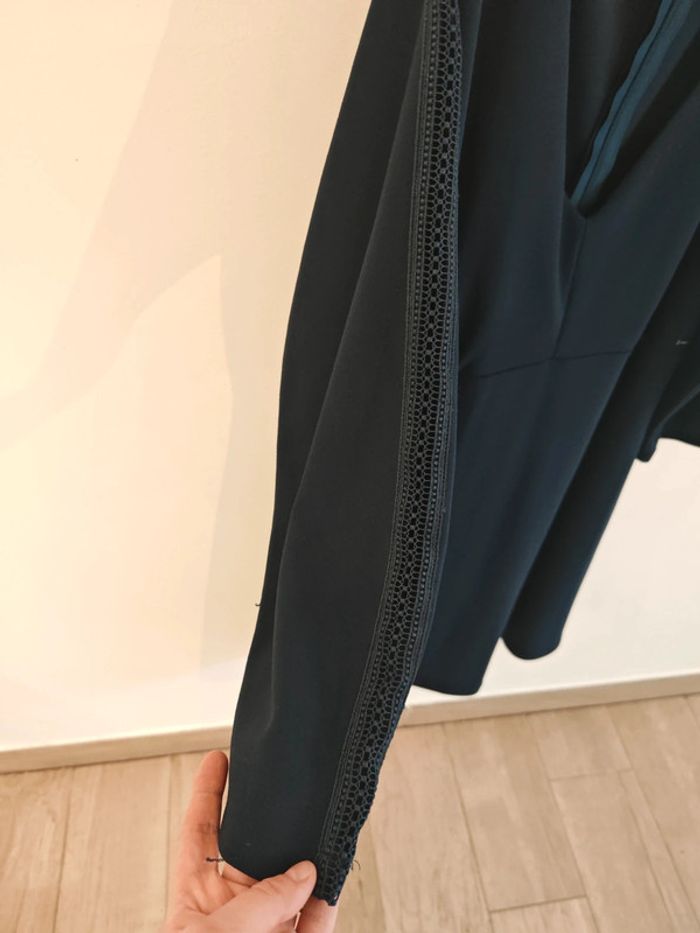 Jolie robe très classe, couleur marine. Ouverture dans le dos par fermeture éclair. Manches avec détails dentelle. Marque Morgan en taille 44 Comme neuve