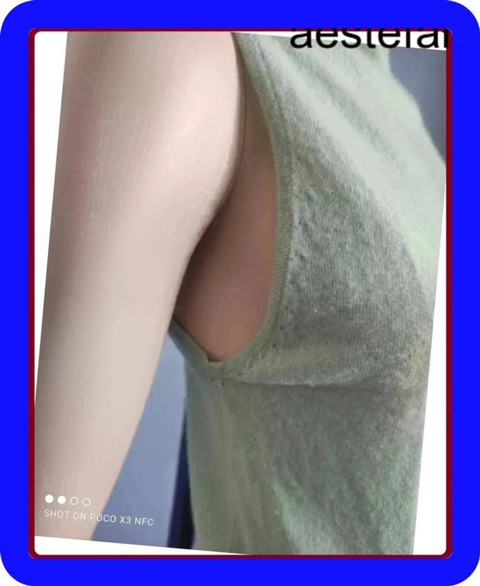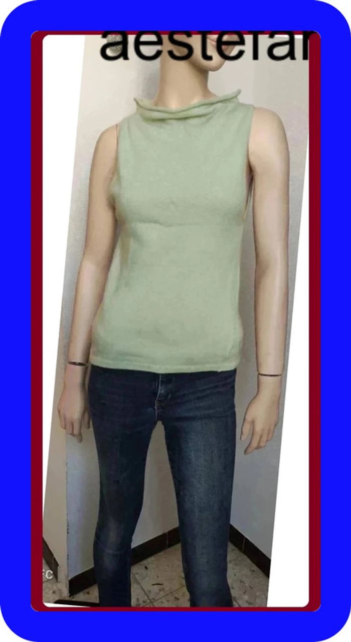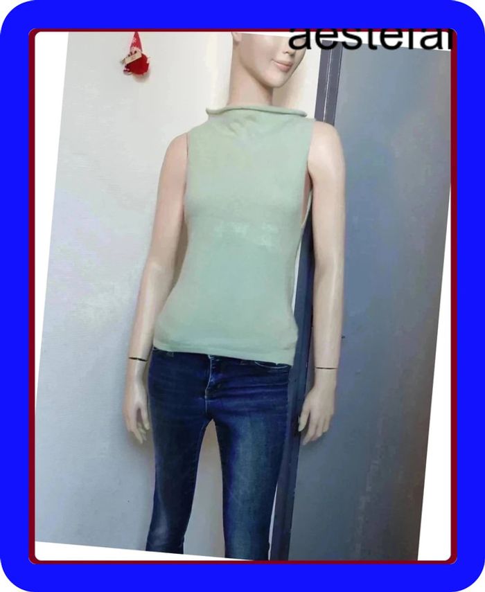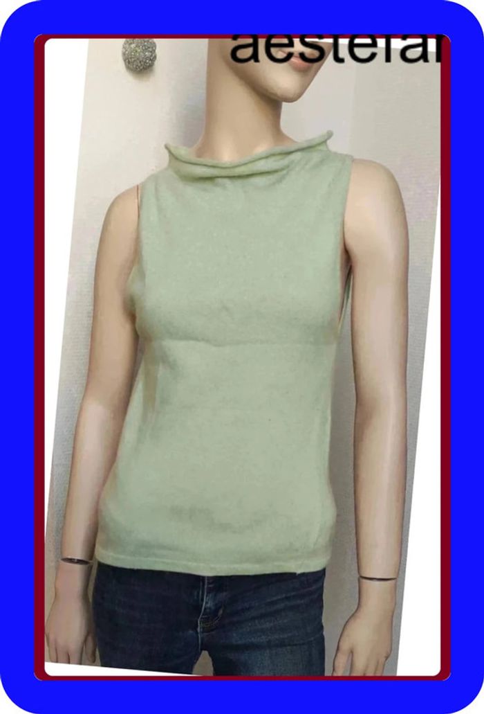 Pull sans manche Vert d'eau 100% cachemire Taille 38, M ou 2 (il n'y a plus l'étiquette) Légèrement échancré au niveau des bras (voir photos) Vous trouverez d'autres vêtements en 36 ou S en cliquant ici #aestefan_38_M #gharani #strok #pull #leger #taille38 #taillem #taille2 #vert #cachemire #ete #ado #femme #fille