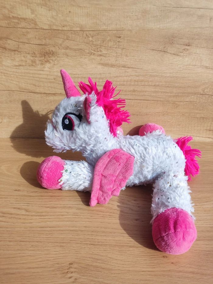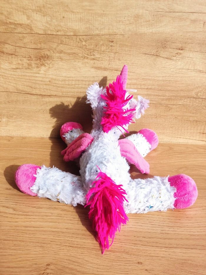 Peluche Licorne Motif rose avec des étoiles paillettes Hauteur 39 cm du haut de sa licorne jusqu'à la patte Elle est en très bon état Elle a été lavée pour la vente