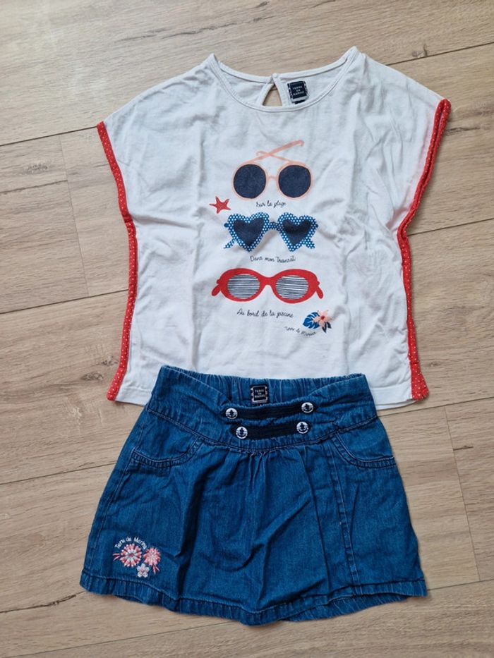 Bel ensemble "lunettes de plage" de chez Terre de Marins Le T-shirt présente 2 minis tâches sur le bas La jupe est comme neuve Mon dressing est rangé par taille. Pour voir tous mes vêtements en 4 ans, cliquez sur le lien #celine_yiyi_4a ATTENTION pour que les liens fonctionnent, pensez à supprimer vos filtres et recherches 😊