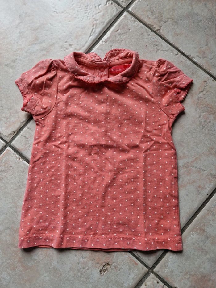 T-shirt MC à pois avec col claudine Très bon état Mon dressing est rangé par taille. Pour voir tous mes vêtements en 18 et 24 mois, cliquez sur les liens #celine_yiyi_18m #celine_yiyi_24m ATTENTION pour que les liens fonctionnent, pensez à supprimer vos filtres et recherches 😊
