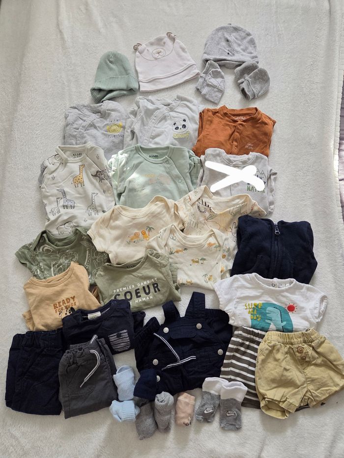 Saison printemps été 4 pyjamas coton kiabi, 2 en bon état et 2 comme neuve - 1 mois 1 pyjama coton zeeman - 0 mois 3 T-shirt ml kiabi, tape à l'œil- 1 mois 4 bodies mc neuve primark - 0 mois 2 pantalon léger dont 1 doublé kiabi comme neuve - 1 mois 1 salopette legere doublé kiabi comme neuve - 1 mois 1 gilet kiabi - 1 mois 1 ensemble short ( décoloré) t-shirt orchestra - 0 mois 1 short rayé- 1 mois 1 bonnet coton avec 2 paires de moufles kiabi 1 bonnet côtelé 1 bonnet ours coton 1 mois 6 paires de chaussettes dont 1 nike