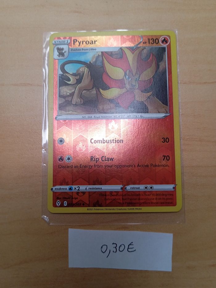 Lire la description ❗ Pyroa Reverse 023/203 Evolving Skies 🇬🇧 Carte Pokémon officielle et en anglais Prix : 0,30€ Etat : EX 📦 Colis protégé et soigné 🚚 Colis envoyé sous 24/48 h