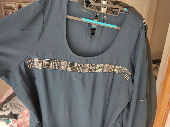 Non portée, juste lavée Robe légère mais non transparente 100% polyester 67 cm entre aisselles et 108 cm de hauteur totale Cordon de serrage à la taille Défaut que je n'avais pas vu lors de l'achat : 3 petites perles manquantes (cf photo) ; peu visible
