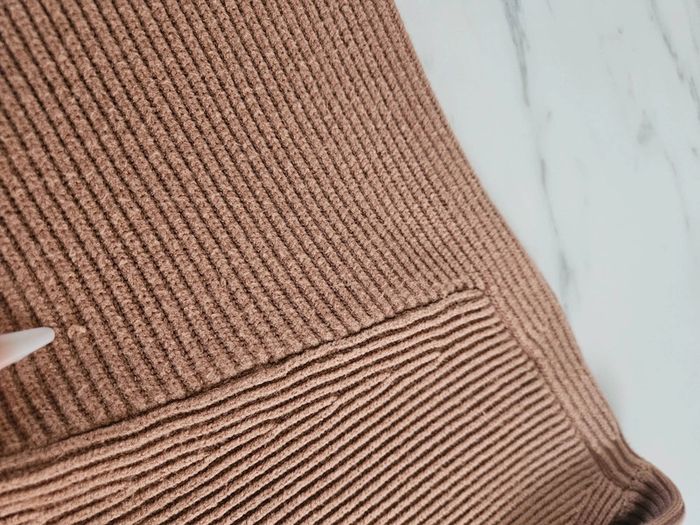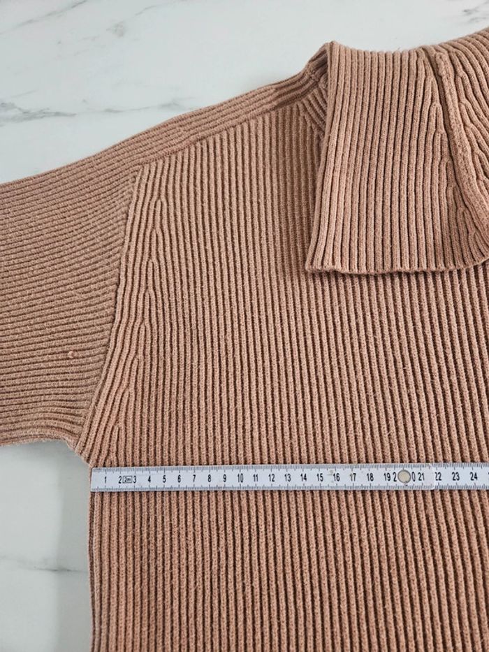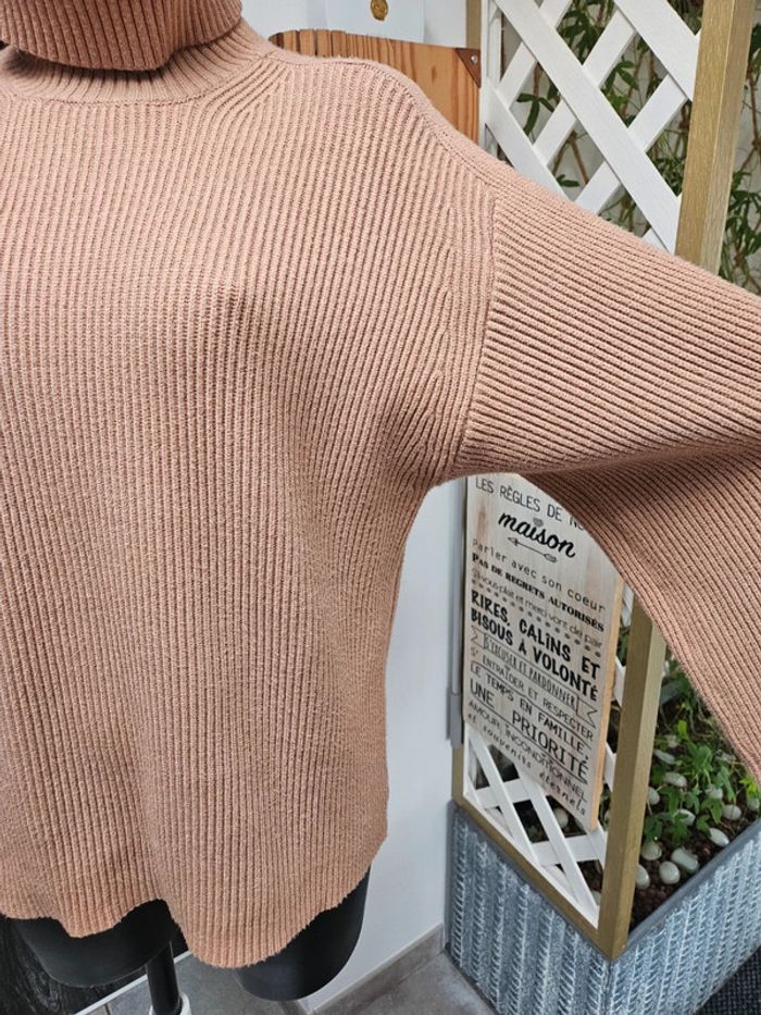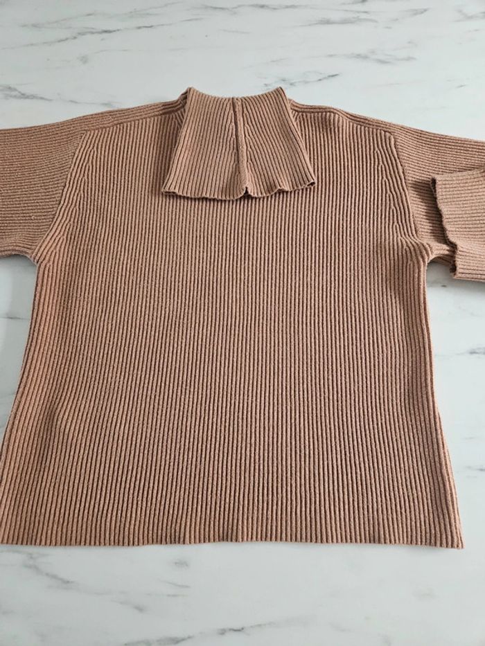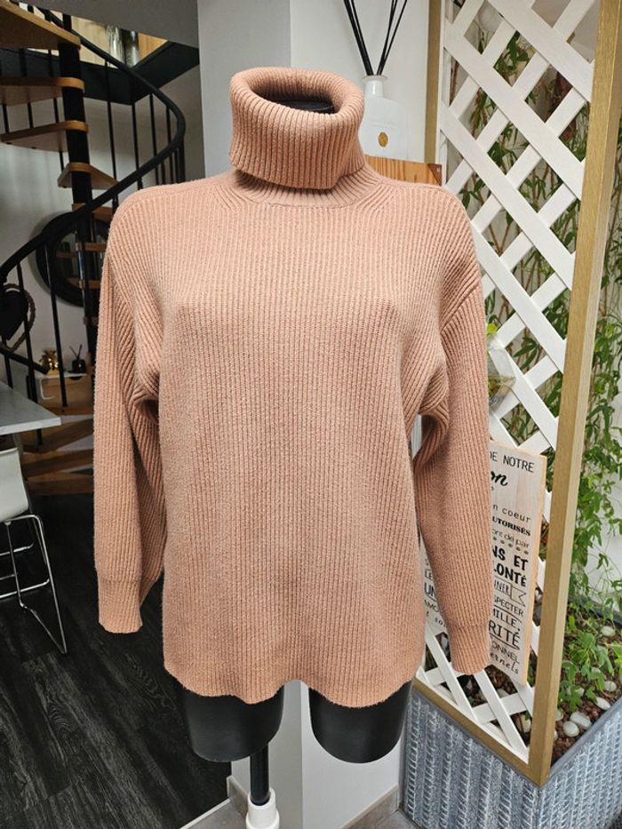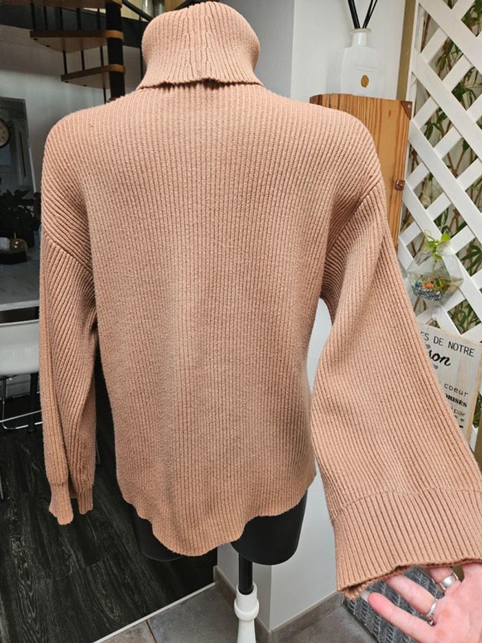 Pull col montant bras larges. Porté mais il reste en bon état. Petit accroc près du dessous de bras mais ne se voit presque pas. Dimensions sur les photos