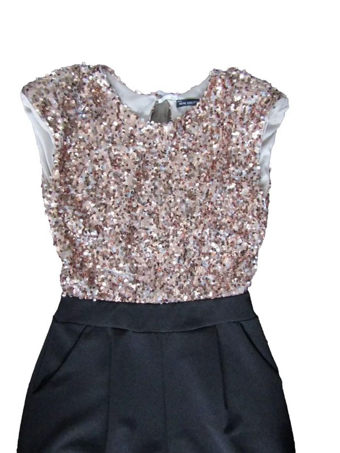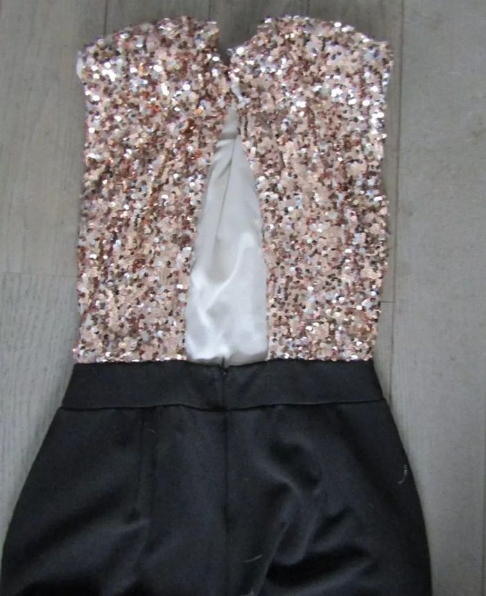 chic combinaison longue partie haute en lamé or marque new collection pas de taille indiquée mais convient a une taille 36/38 mais bien confirmer avec les mesures prises en cms et a plat aisselles 48 taille 33 longueur 152 longueur entre jambes 77 envoi rapide 1 jour maxi après l'achat achats multiples = frais de port réduits