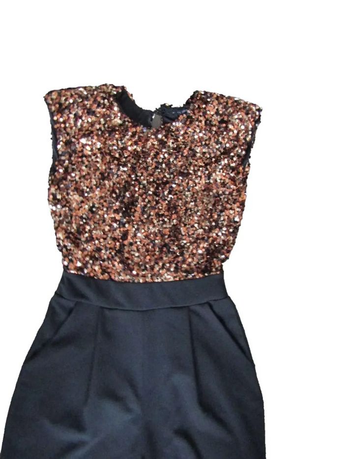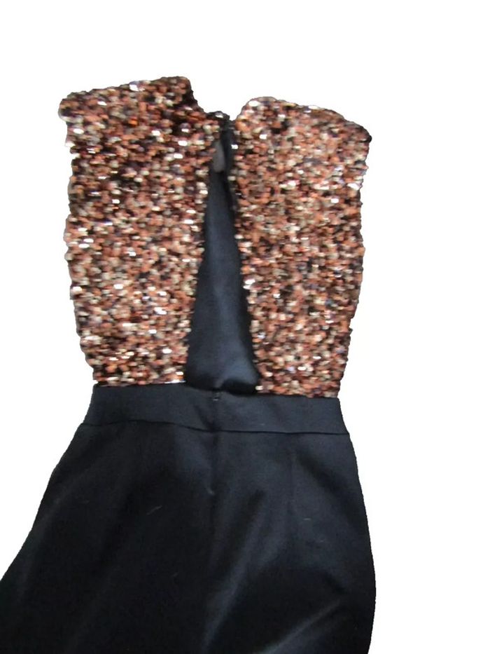 chic combinaison longue partie haute en lamé noir bronze et or marque new collection pas de taille indiquée mais convient a une taille 36/38 mais bien confirmer avec les mesures prises en cms et a plat aisselles 48 taille 33 longueur 152 longueur entre jambes 77 envoi rapide 1 jour maxi après l'achat achats multiples = frais de port réduits
