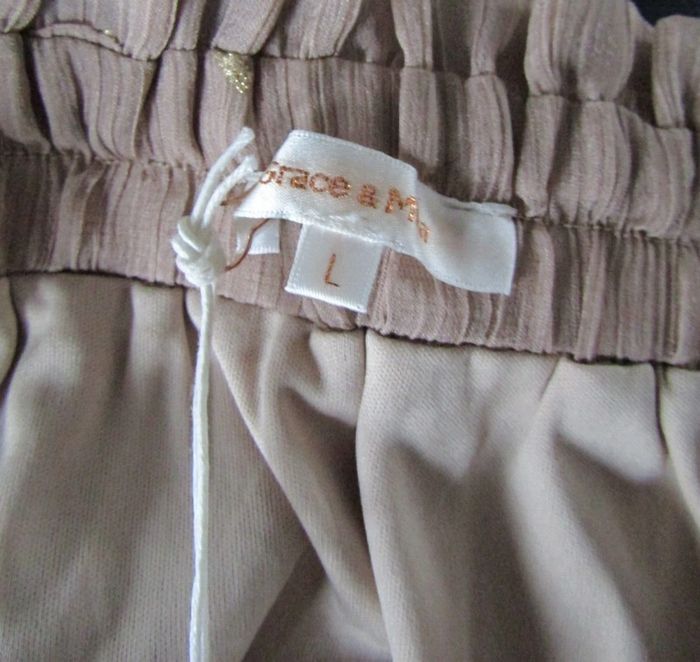 neuf avec étiquettes jupe courte et vague tissu fluide toucher effet soie doublée couleur beige avec petits dessins dorées marque grace & mila taille indiquée L = 40/42 mais bien confirmer avec les mesures prises en cms et a plat taille sans tirer 39 en tirant au maxi 51 longueur 45 envoi rapide 1 jour maxi après l'achat achats groupés = frais de port groupés