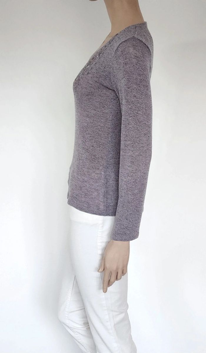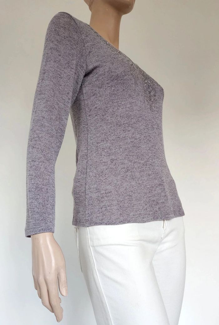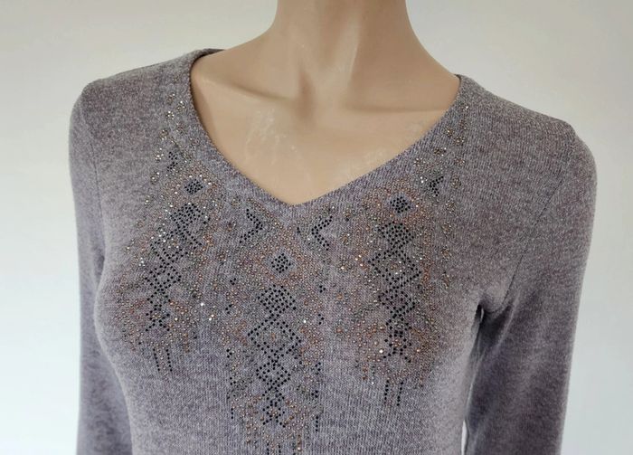 Un pull col V chiné gris/marron de 62cm de long Largeur épaules 36cm Aisselles à aisselles 44cm Strass au niveau de la poitrine Jacqueline Riu Taille 36