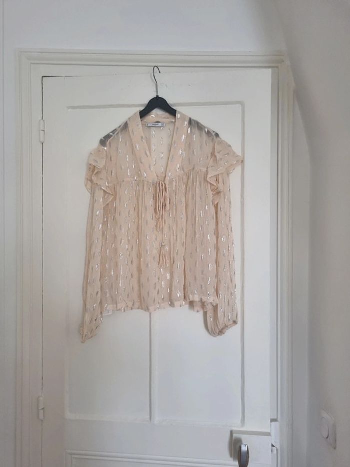 Longueur totale environ 61cm Volant au niveau des manches Non Doublée #top38 #topmango #blouse38 #blousemanchelongue #blousemango38 #blouserosepoudré #blousefilargente #mango38 #blousefluide #blousefluide38