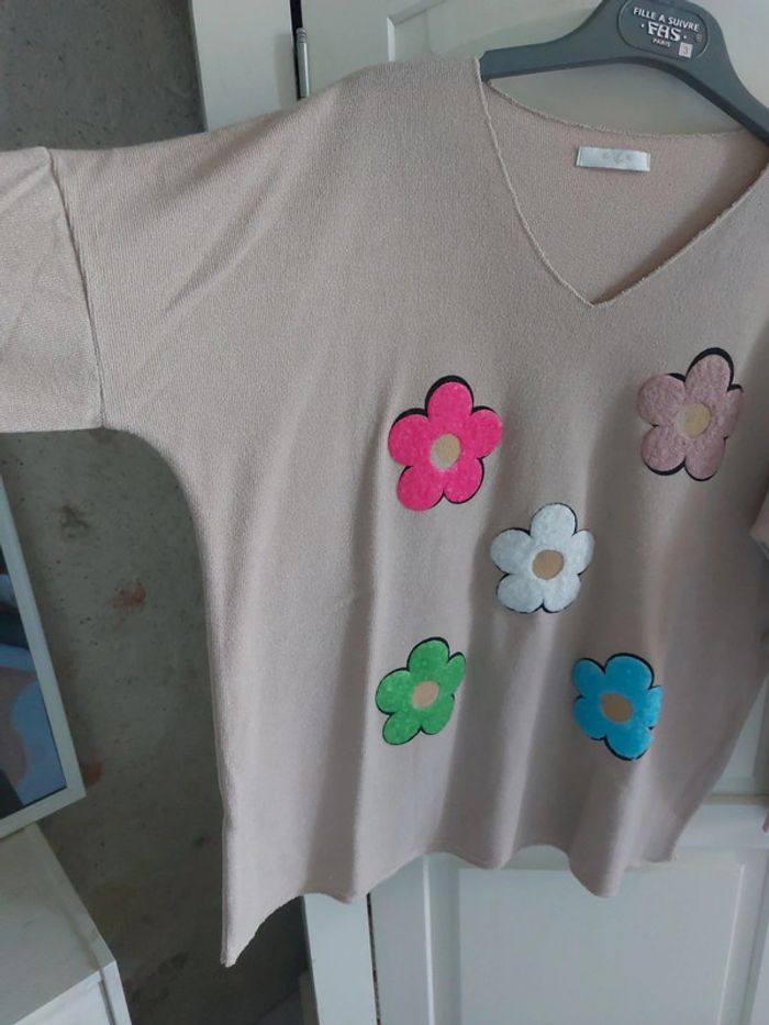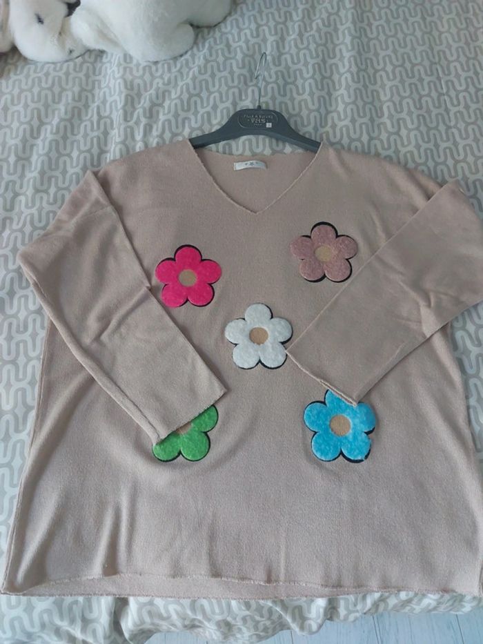 Juste lavé à l achat, joli pull beige couleur sable à fleurs Se porte large correspond à une taille jusque 44 suivant morpho 56cm aisselle à aisselle, 60cm hauteur totale Acheté en boutique l année dernière 39€ vend 19€ Remise sur lot D autres jolies choses dans mon dressing
