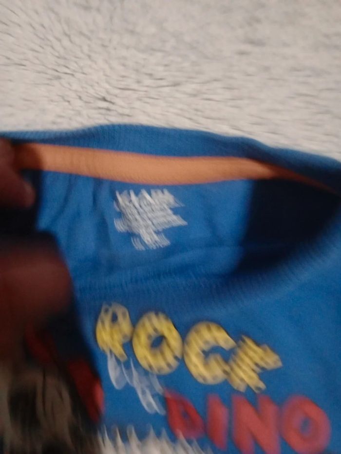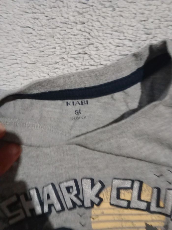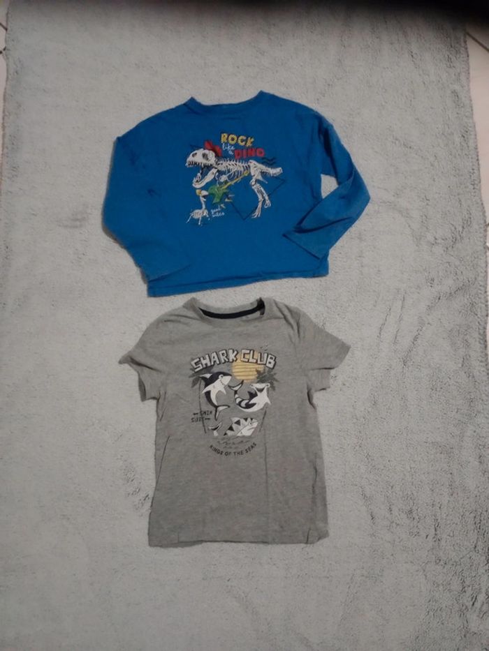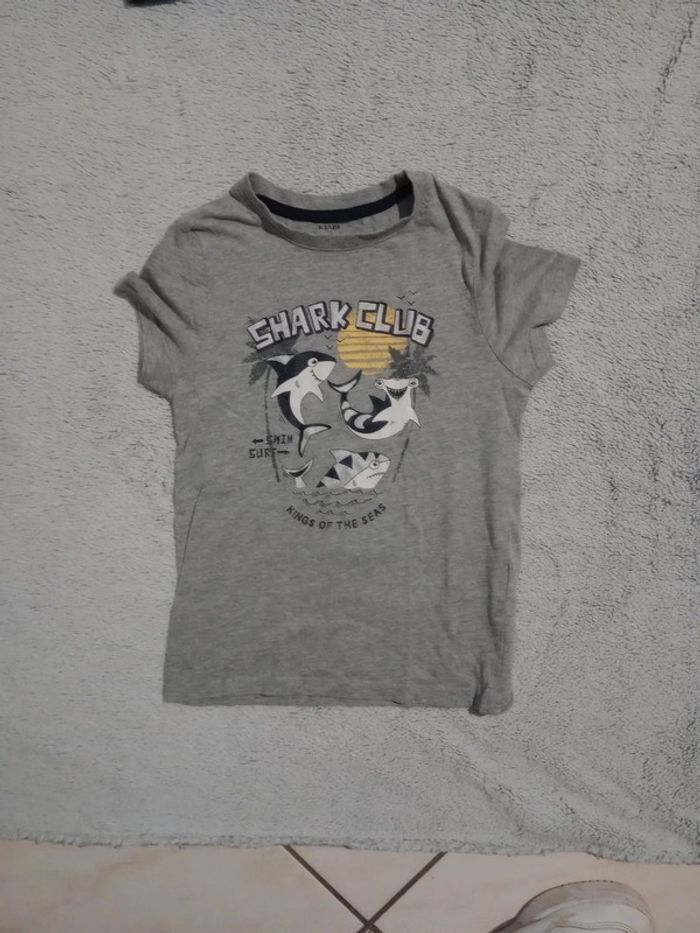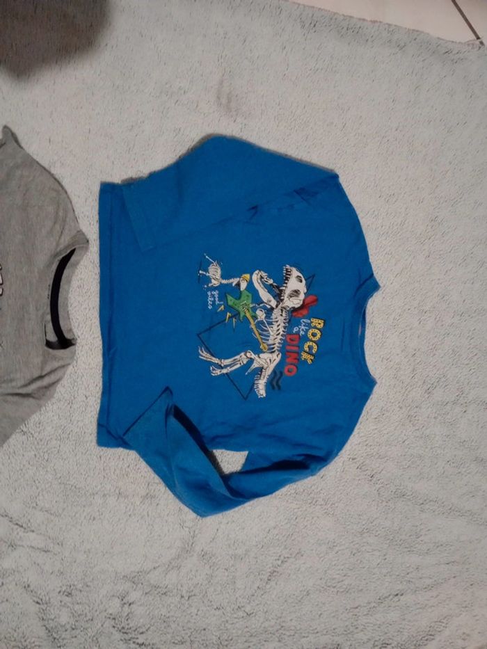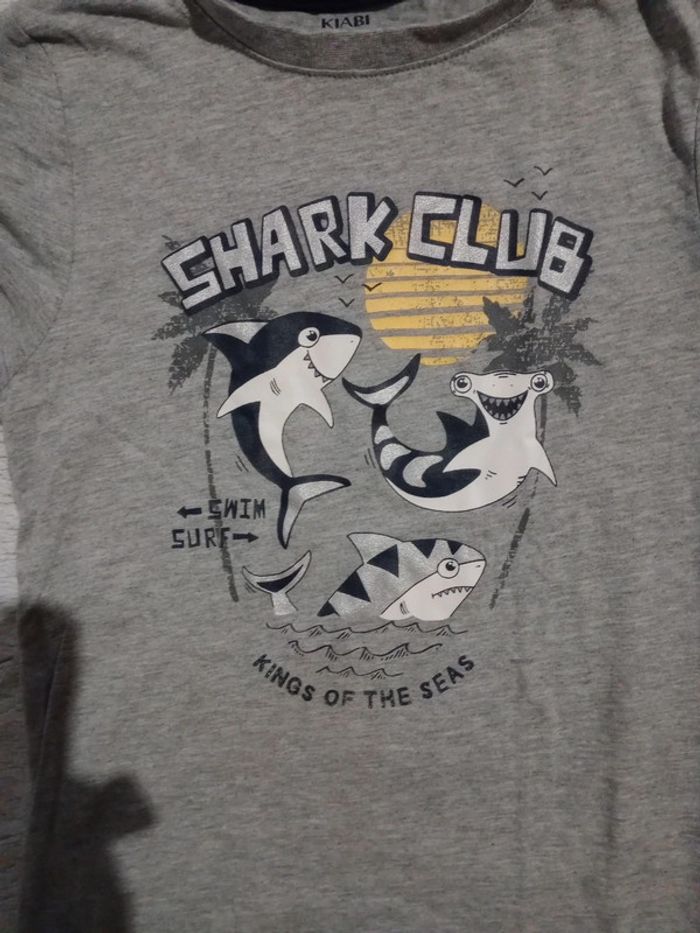 Lot composé d'un t-shirt à manches longues bleu « rock like Dino » marque Kiabi 100 pour 100 cotonet d'un t-shirt gris manches courtes shark club marque Kiabi 60 % coton 40 % polyester #carineleray_8a